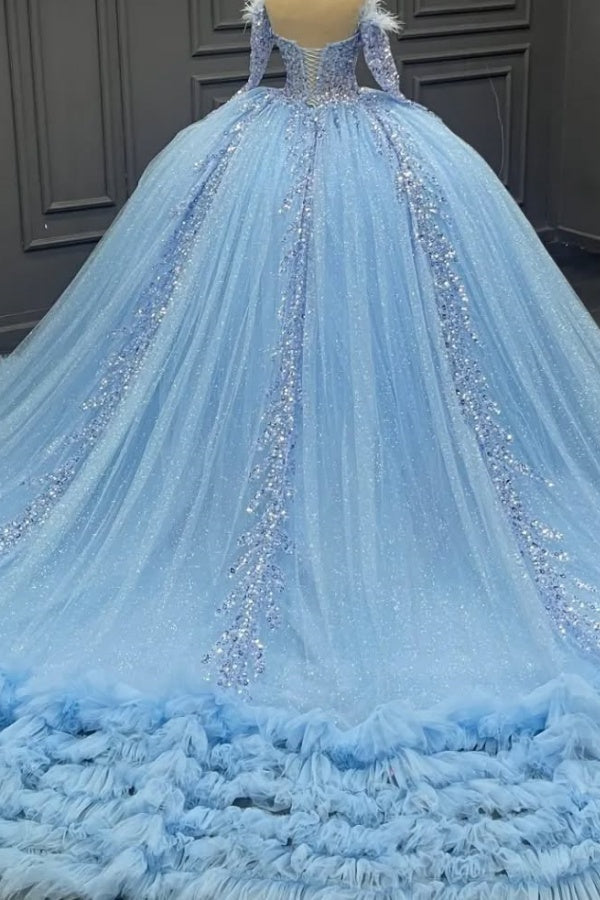 Description: Create a statement of elegance in our WQ1327 Ball Gown. With an off-shoulder design, long sleeves, and intricate sequins, this dress exudes sophistication. Fully beaded and adorned with feather ruffles, the tiered lace up adds a touch of glamour to this sparkly blue tulle dress. Perfect for a memorable sweet sixteen.