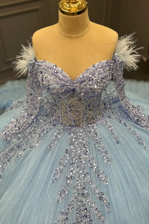 Off Shoulder Long Sleeves Sequins Beaded Feather Tiered Blue Quinceanera Dress for Sweet 16 WQ1327