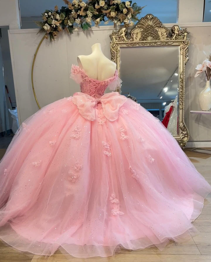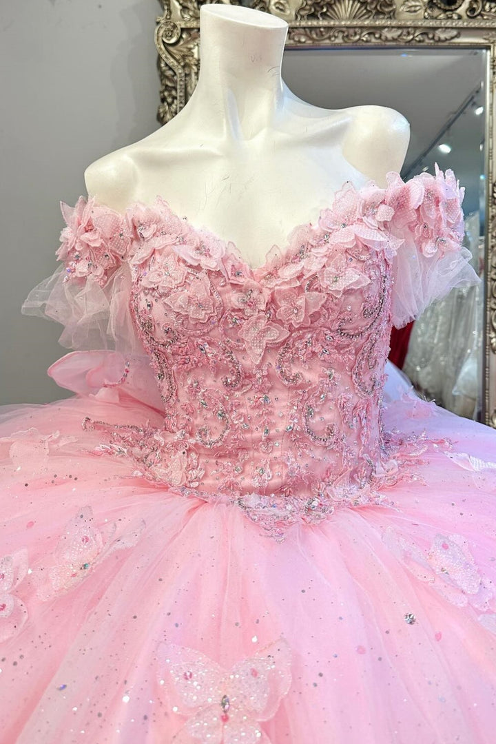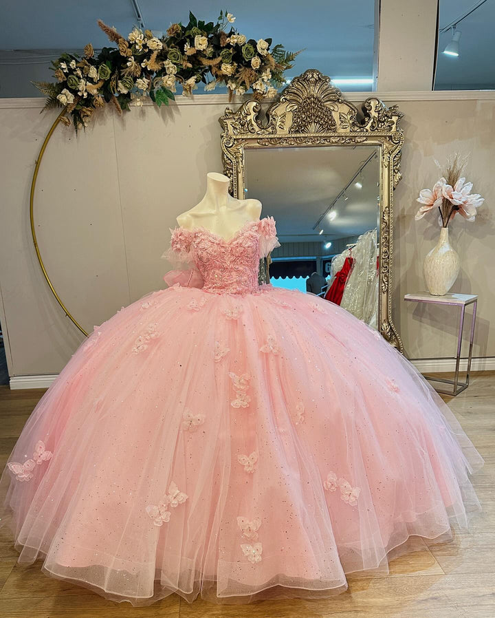 Description: This exquisite quinceañera dress showcases an off-shoulder, sleeveless design embellished with intricate 3D butterfly appliques and delicate beadwork. The soft pink color enhances its youthful elegance, while the detailed embellishments add texture and visual interest. Designed for both comfort and style, this dress is an ideal choice for a memorable Sweet 15 celebration, combining sophistication with a touch of whimsical charm.