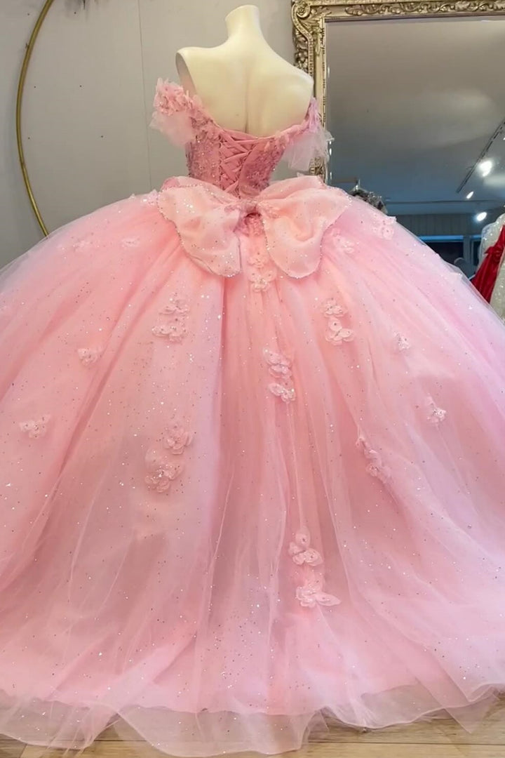 Off Shoulder Sleeveless 3D Butterfly Appliques Beaded Pink Sweet 15 Quinceañera Dress WQ1549