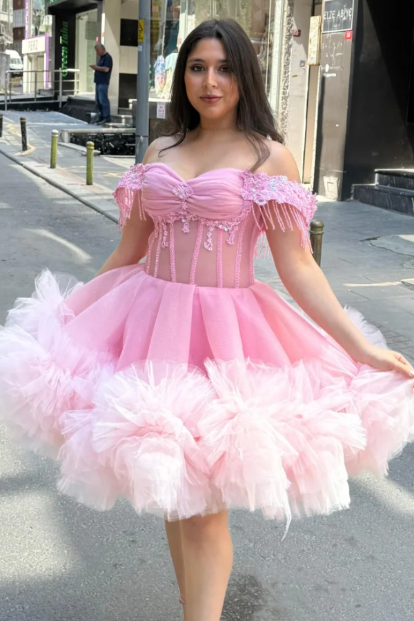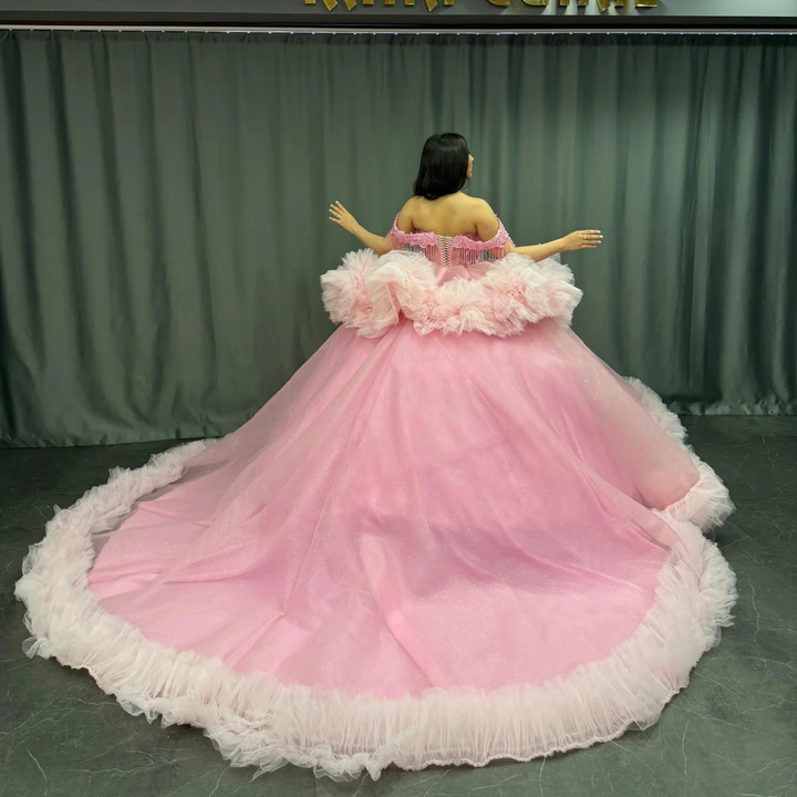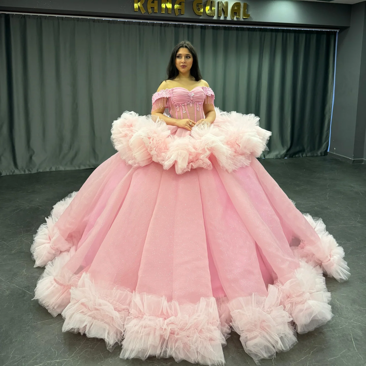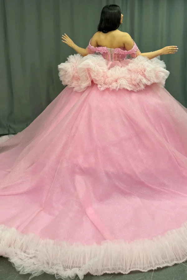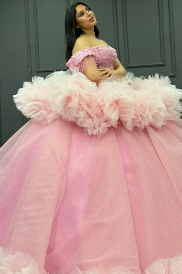 Description: Get ready to turn heads in this stunning WQ1462 Quinceanera dress. The off shoulder neckline and sleeveless design offer a modern touch, while the pleated and ruched details create a flattering silhouette. The delicate appliques and beaded accents add a touch of elegance to the tiered pink tulle gown. Perfect for any formal occasion or birthday party celebration.