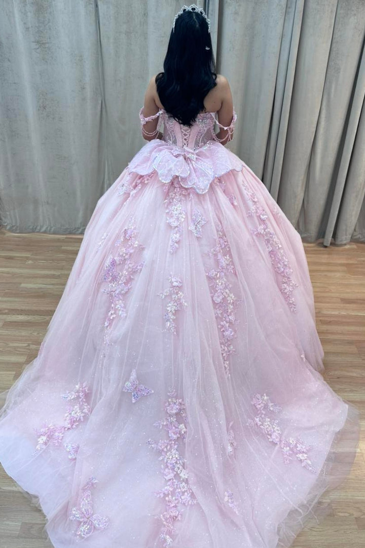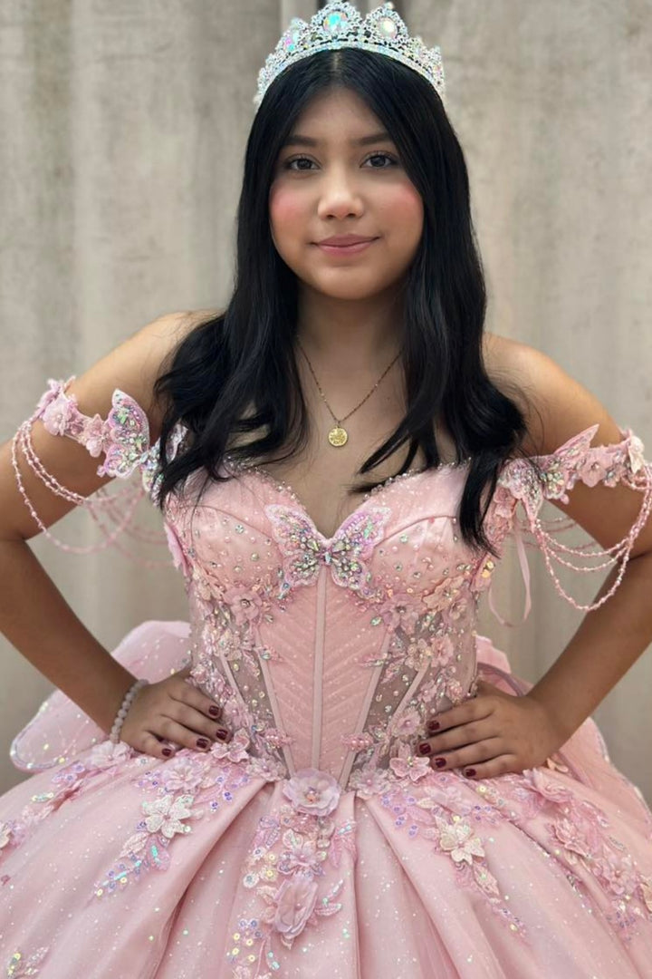 Description: This elegant pink quinceañera dress features an off-shoulder, sleeveless design adorned with delicate beaded butterfly appliques, adding a touch of intricate detail and charm. The bow knot accent at the back enhances its feminine silhouette, perfect for a memorable Sweet 15 celebration. Crafted to combine comfort and style, this dress ensures you stand out with grace and sophistication on your special day.