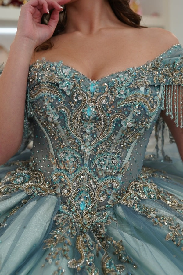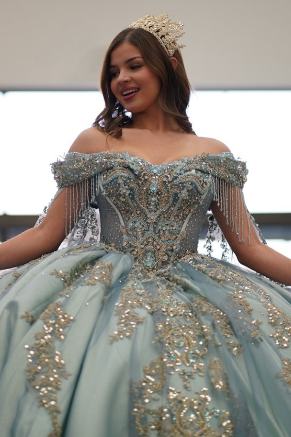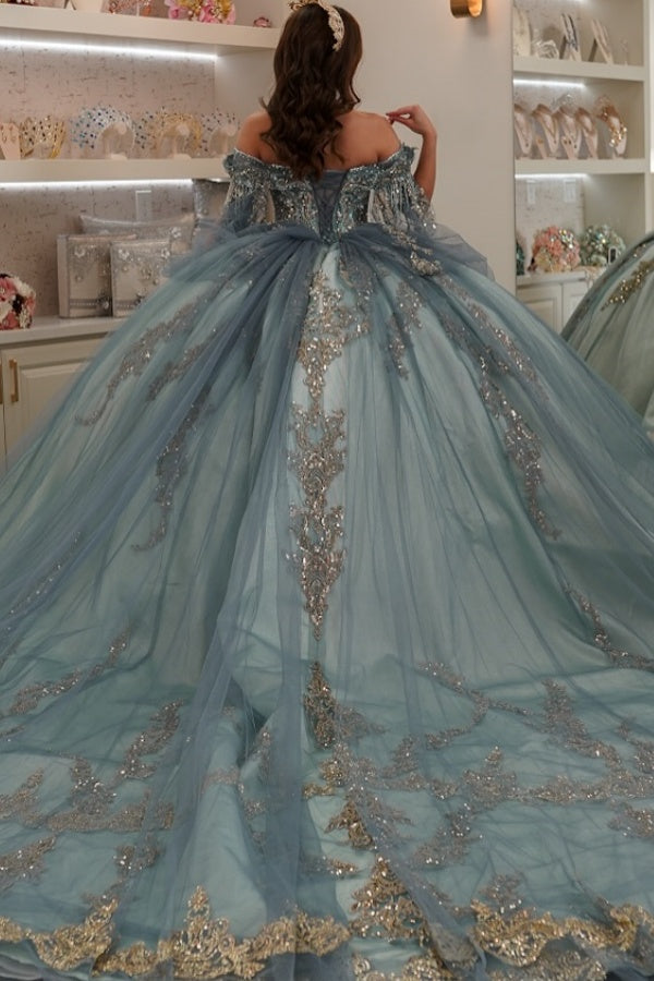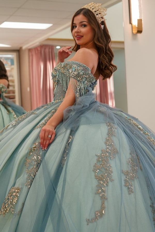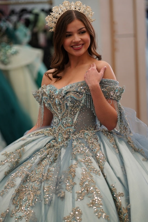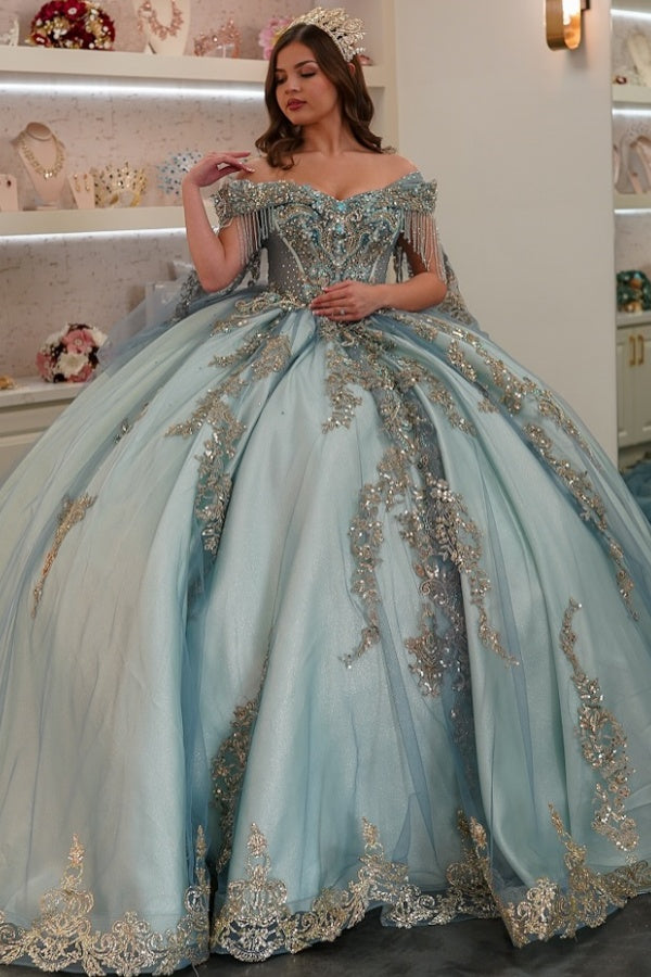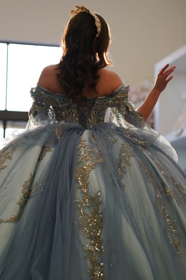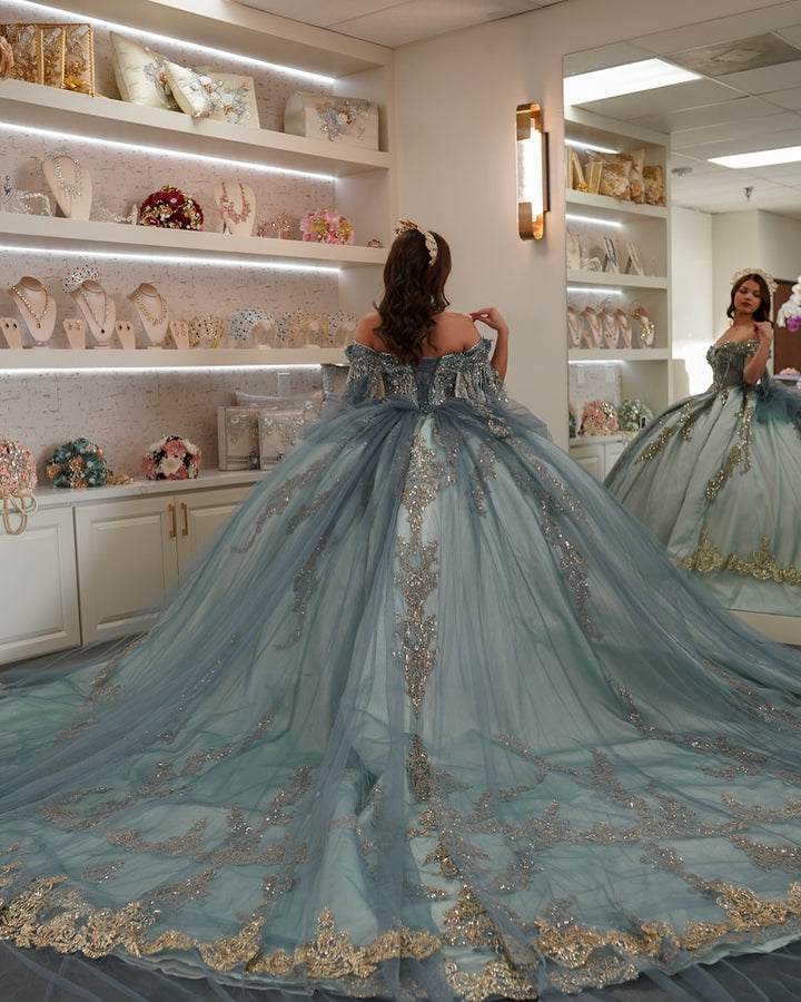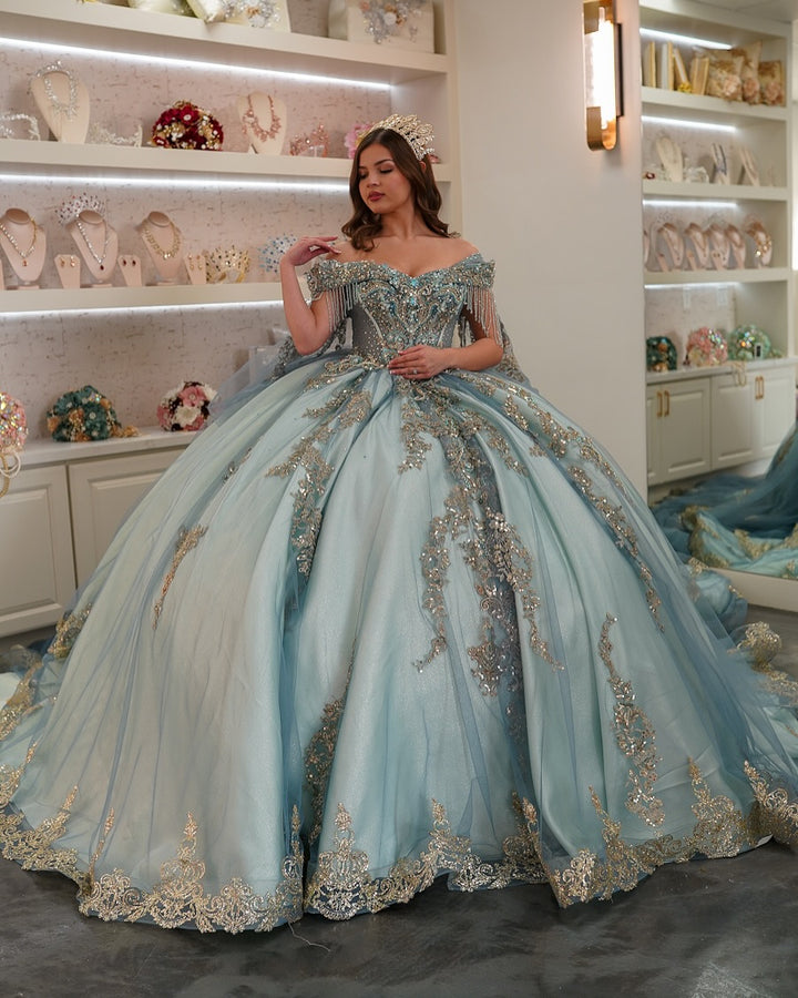 Description: As an industry expert, we present the WQ1415 Quinceañera Dress. This customizable ball gown features a beautifully beaded, off-shoulder bodice with intricate gold appliques. The sleeveless design and lace-up back add a touch of elegance, while the blue tulle skirts adds volume and grace. Perfect for any birthday celebration or formal event.