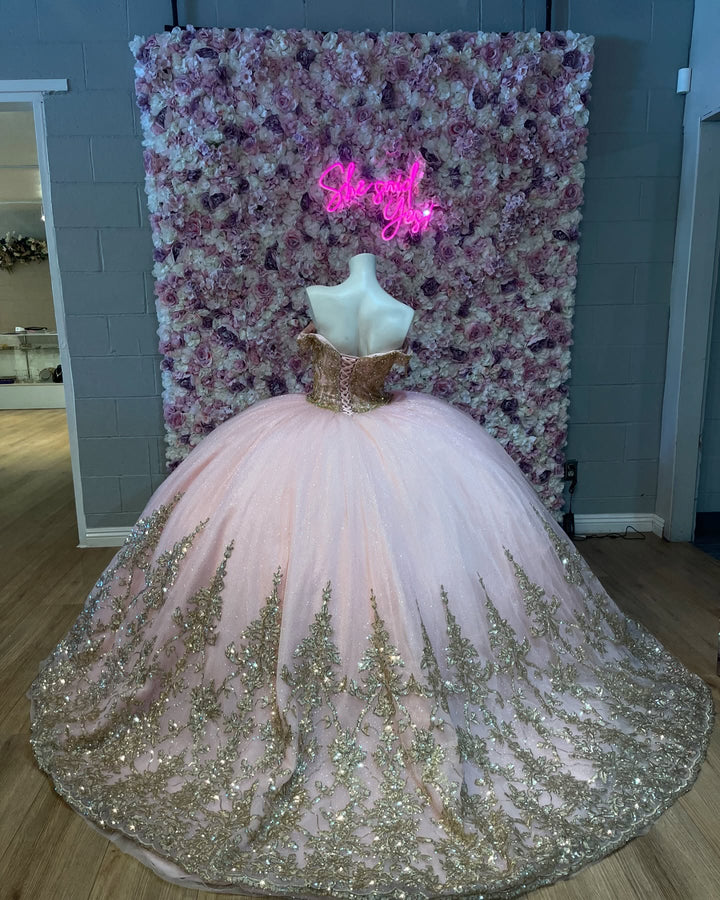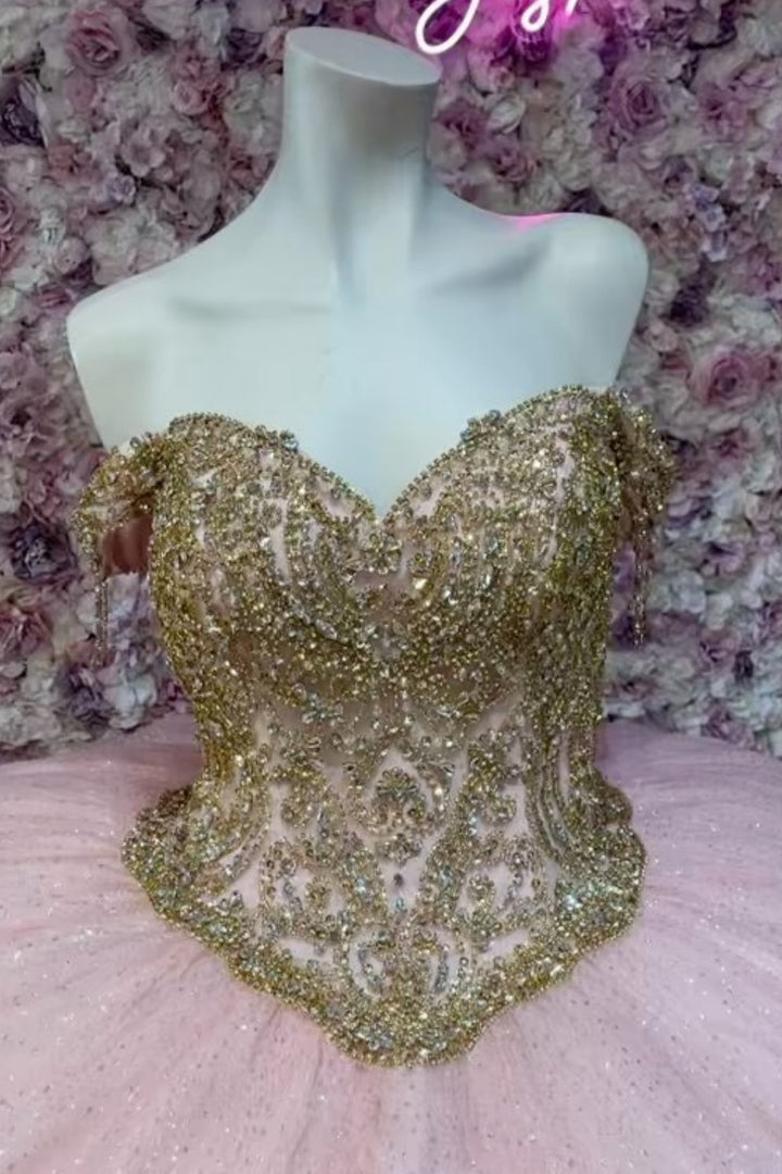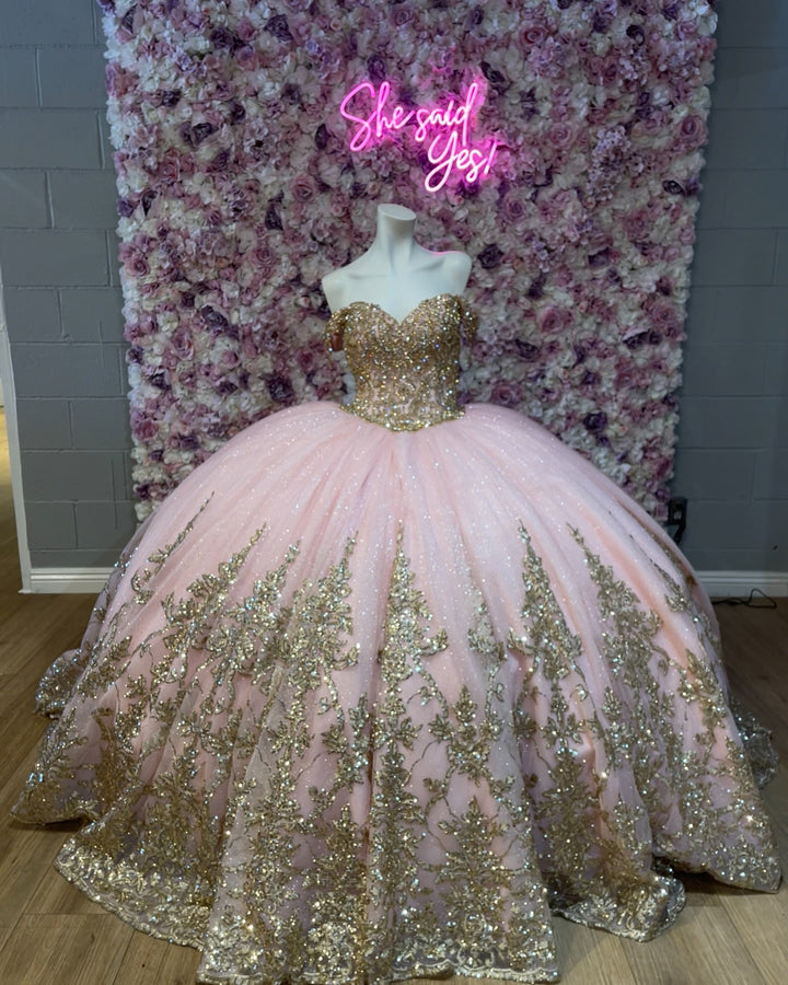 Description: This stunning pink quinceañera dress features an off-shoulder, sleeveless design embellished with sparkling gold beaded appliques. Its radiant details create a luxurious shimmer, perfectly complementing the youthful elegance of a Sweet 15 celebration. Designed to provide a flattering fit, this dress ensures a memorable and sophisticated look for this special milestone.