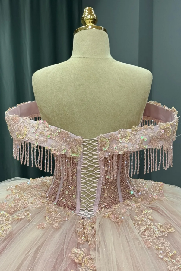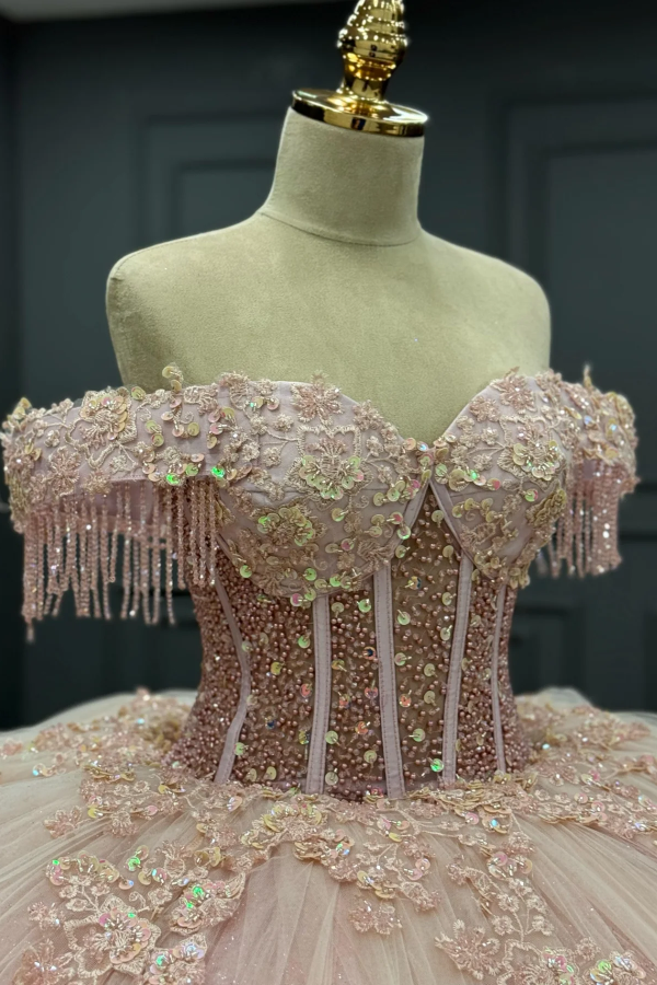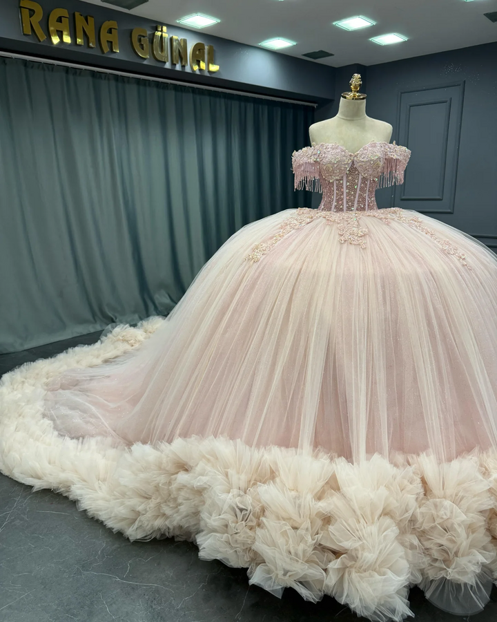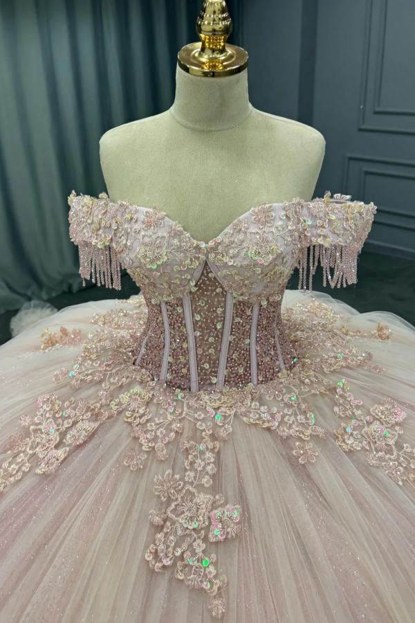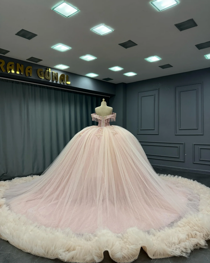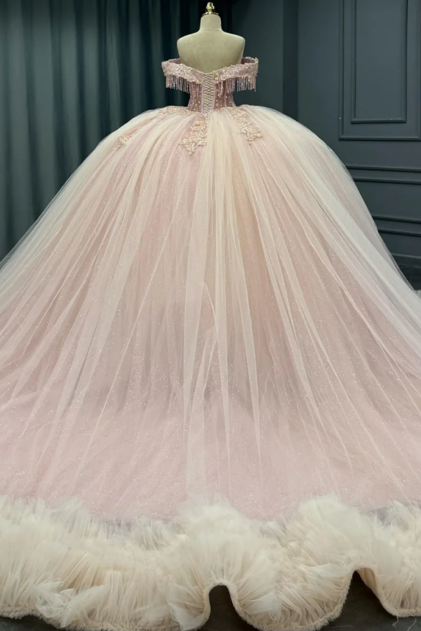 Description: Transform into royalty with our WQ1468 ball gown, where ethereal baby pink tulle meets sophisticated design elements. This breathtaking creation features an elegant off-shoulder neckline and sleeveless silhouette that frames your figure perfectly. The meticulously pleated bodice showcases expert craftsmanship with its harmonious blend of beading, sequins, and delicate appliques. The showstopping tiered skirt creates dramatic volume and movement, making this gown the ultimate choice for quinceañeras, sweet sixteen celebrations, and formal galas where making a memorable impression is paramount.