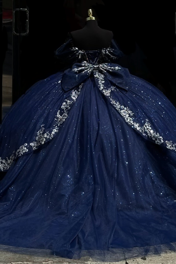 Description: Indulge in luxury with our WQ1383 ball gown, featuring an off shoulder neckline and sleeveless design. Adorned with delicate silver appliques and sparkling beaded detailing, this dark navy tulle dress is perfect for a sweet 16 or any special occasion. Stand out and make a statement with this elegant and exclusive piece.