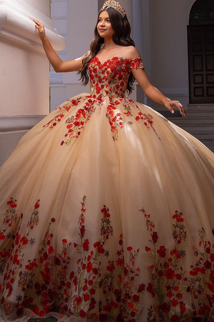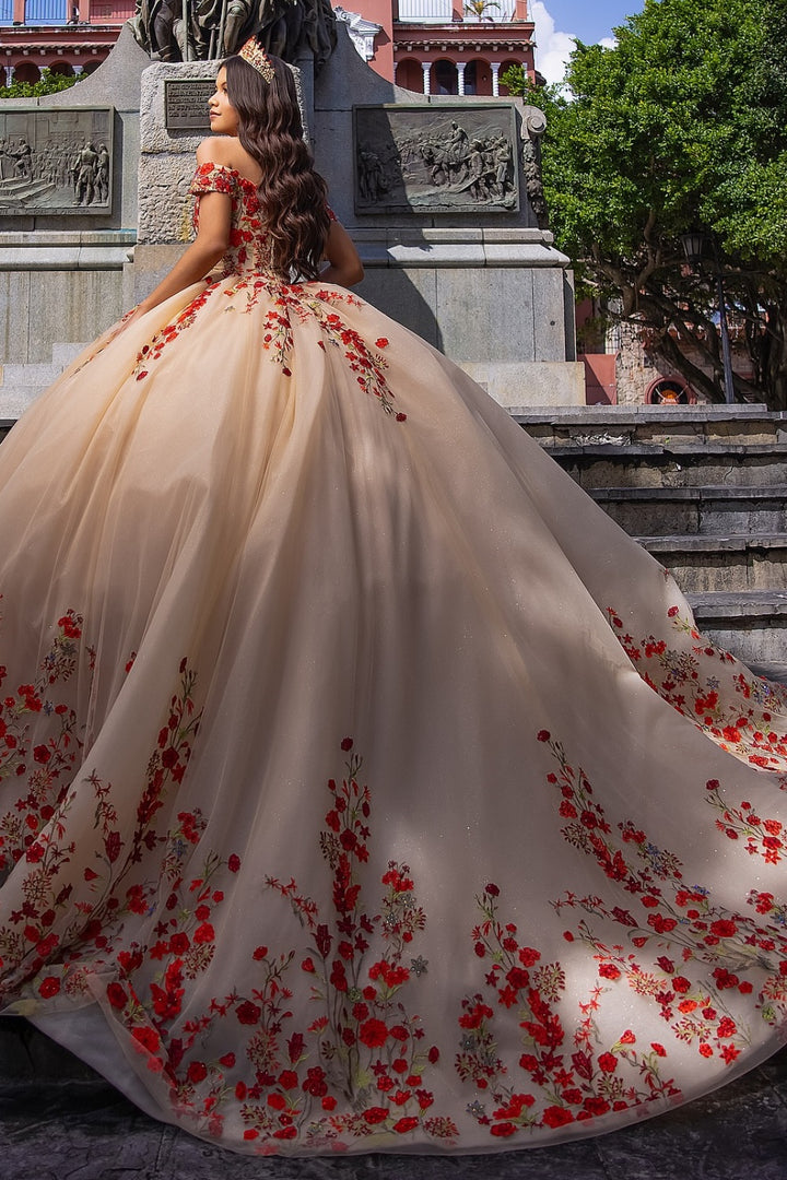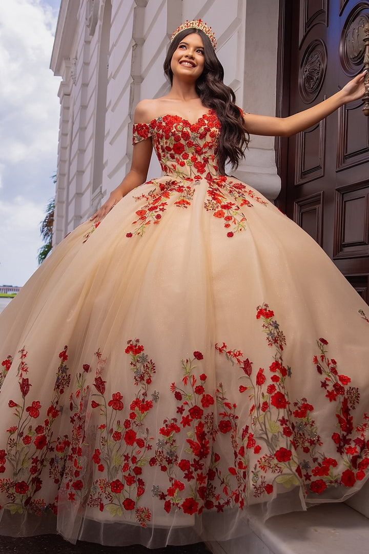 Description: Step into your quinceañera with understated luxury in this champagne gown that epitomizes timeless beauty. The off-shoulder design elegantly exposes the collarbone and shoulders, creating a sophisticated, romantic aesthetic. Sleeveless construction allows for graceful movement while delicate flower appliques add refined embellishment without overwhelming the silhouette. The warm champagne tone flatters a variety of skin tones and photographs beautifully, making it an excellent investment for your Sweet 15 celebration. This expertly tailored dress combines classic quinceañera traditions with contemporary design sensibilities, offering a versatile option for those seeking an elegant, understated gown that remains timelessly beautiful for years to come.