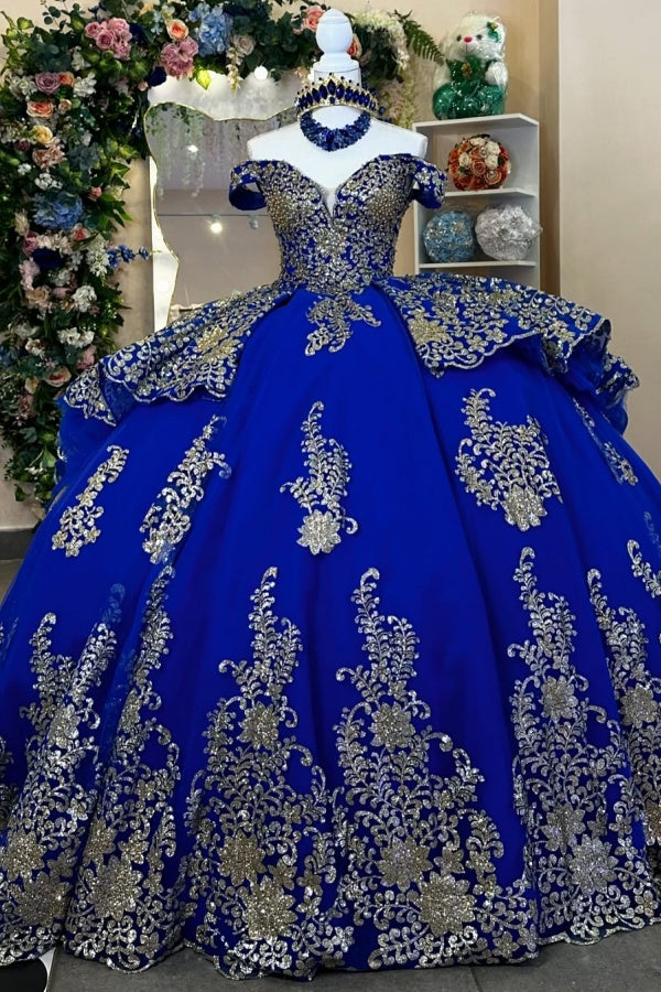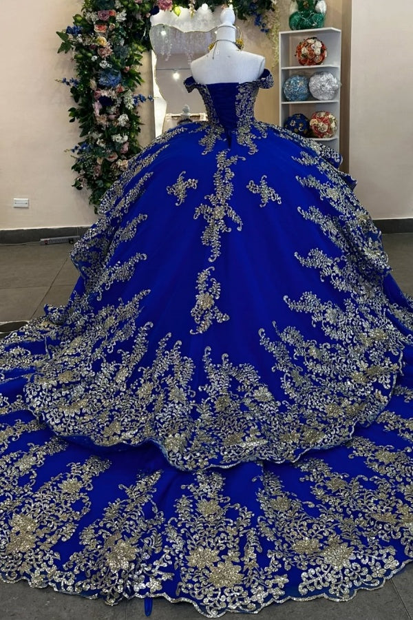 Off Shoulder Sleeveless Gold Appliques Royal Blue Quinceañera Dresses WQ1423