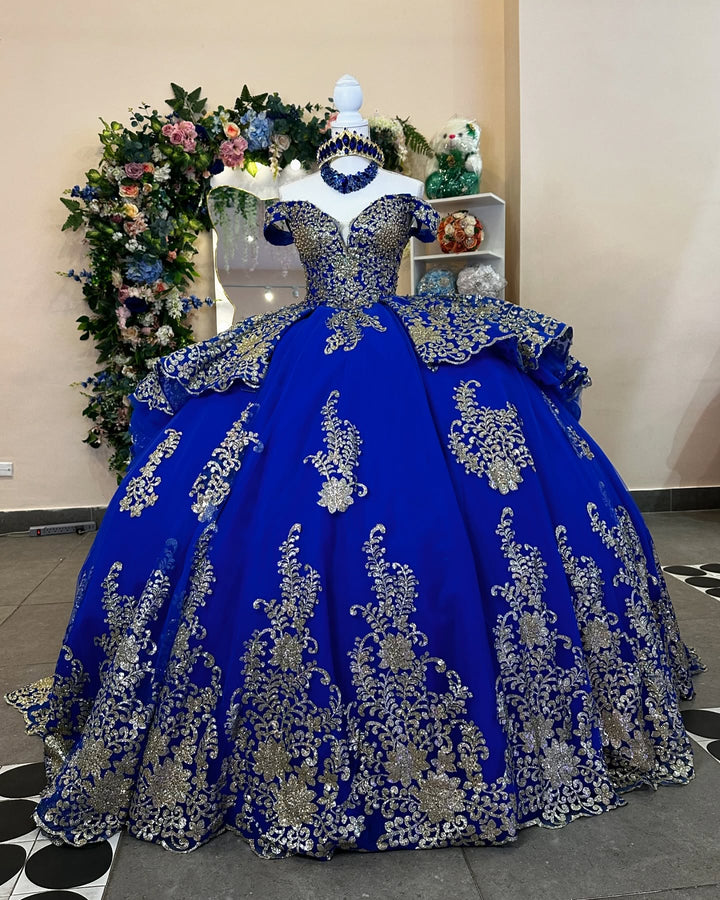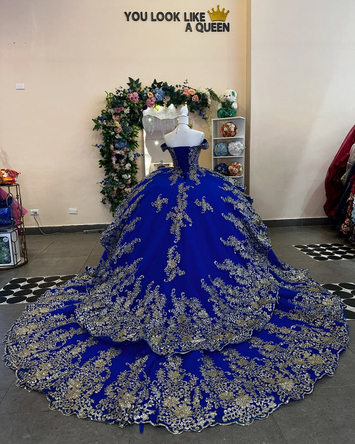 Description: Indulge in royalty with our WQ1423 ball gown dress. Off-shoulder and sleeveless, it features intricate gold appliques on a stunning royal blue satin fabric. Perfect for Quinceañera, formal events, and sweet 16 parties. Experience elegance and style in our exquisite design.