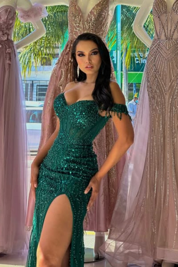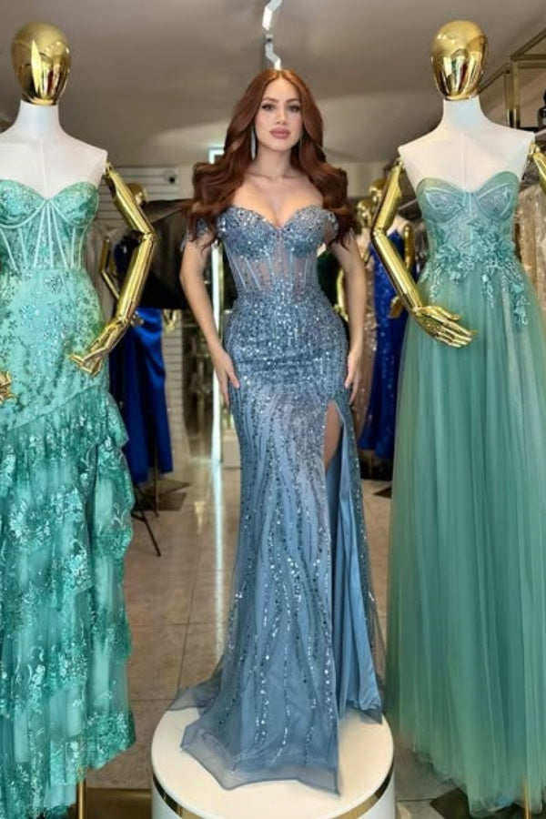 Off Shoulder Sleeveless Sequins High Side Slit and Train Prom Party Dress WU1057