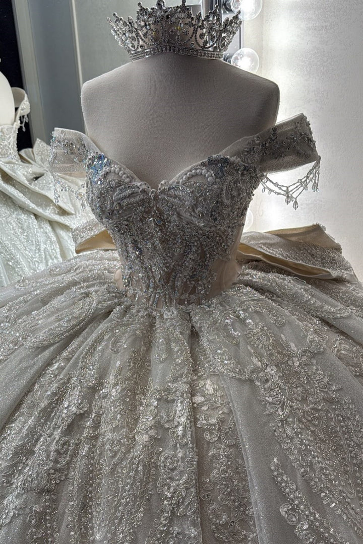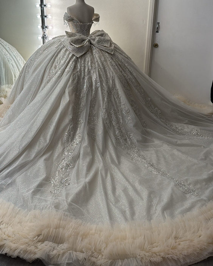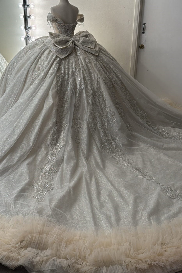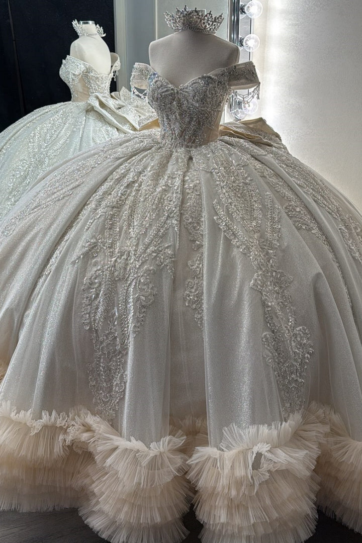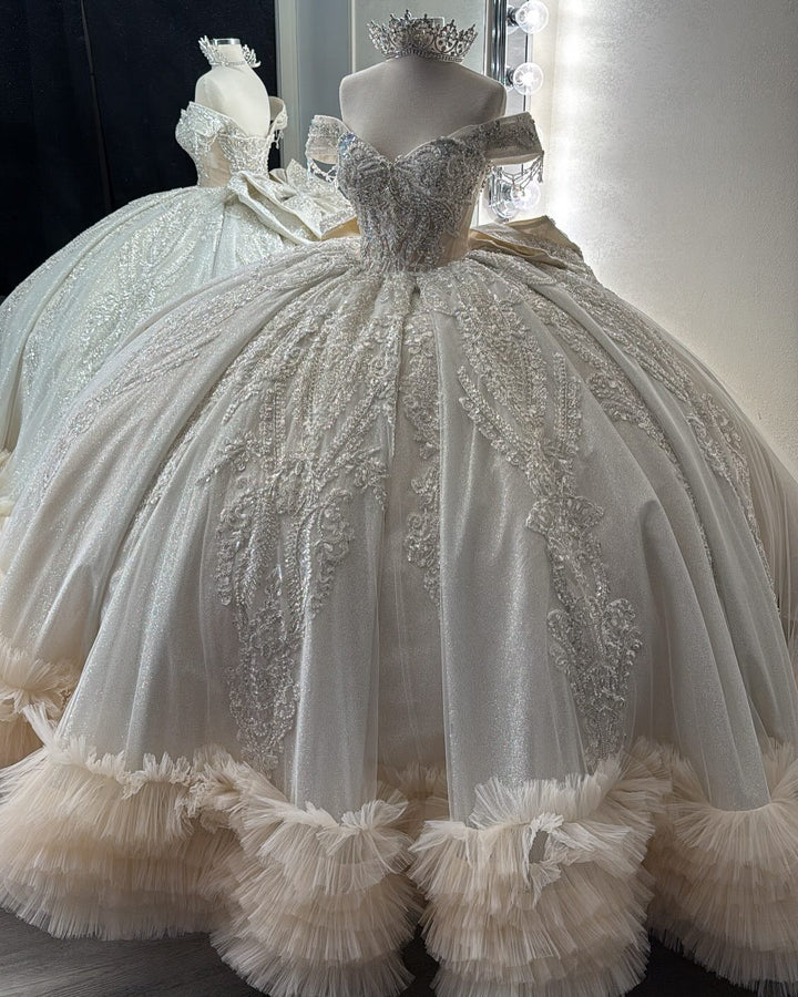 Description: This sheer champagne quinceañera dress features an off-shoulder, sleeveless design embellished with delicate beaded sequins and intricate appliques. A charming bow knot accent adds a refined detail, enhancing its elegant silhouette. Designed for comfort and style, this dress offers a graceful and sophisticated look perfect for celebrating a Sweet 15 milestone.