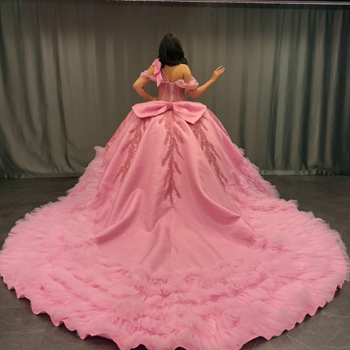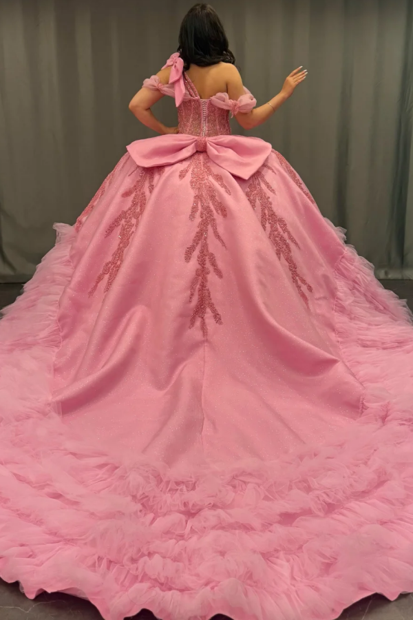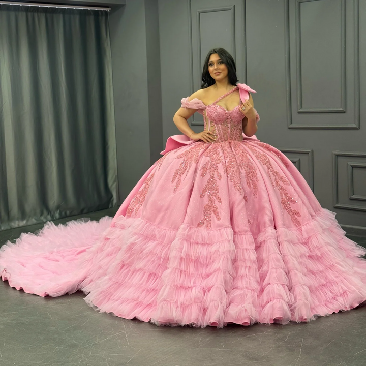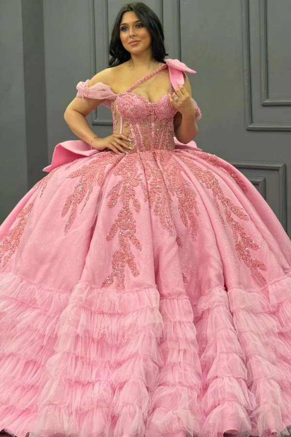 Description: Unleash your inner princess with our WQ1461 ball gown! This one shoulder, sleeveless dress features intricate beaded sequins appliques and a tiered tulle skirt, all adorned with sparkly pink satin. Perfect for quinceaneras, sweet 15/16 parties, or any formal occasion. Feel like royalty in this stunning and elegant gown.