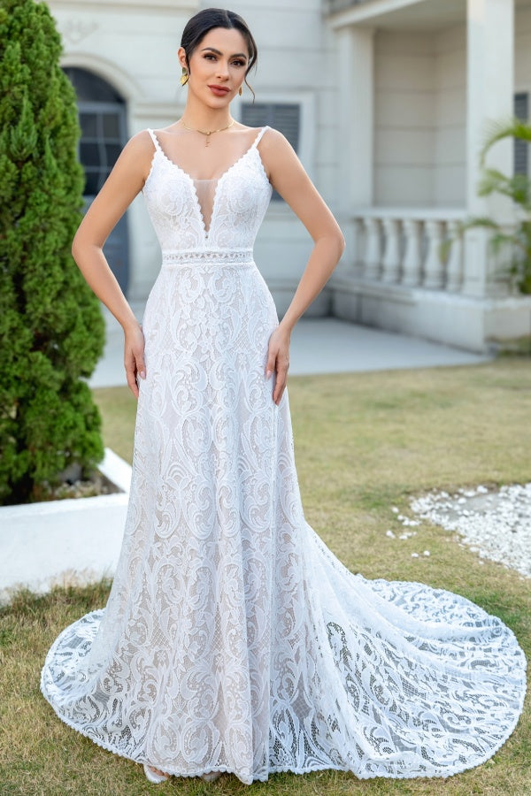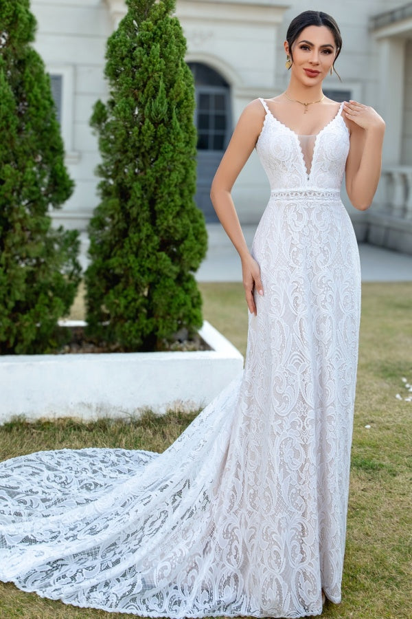 Sheath Low V Neck Spaghetti Straps Lace Open Back Court Train Wedding Dress WW1048