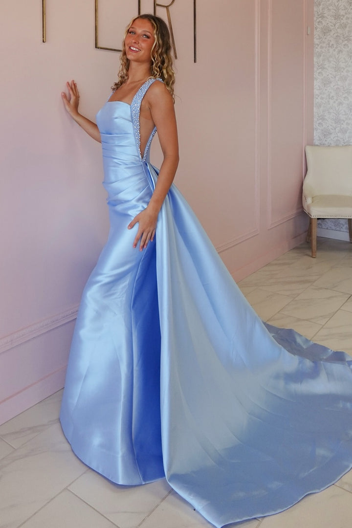 Sheath Square Neck Straps Sleeveless Beaded Pleated Blue Prom Dress WU1571
