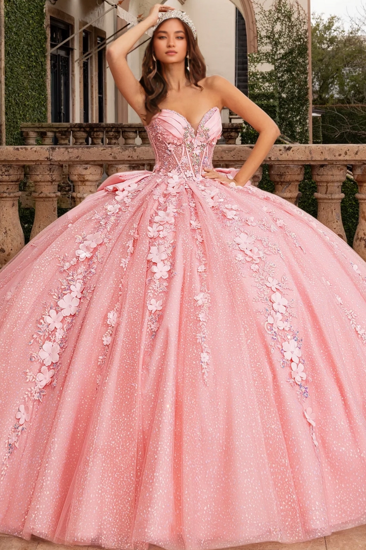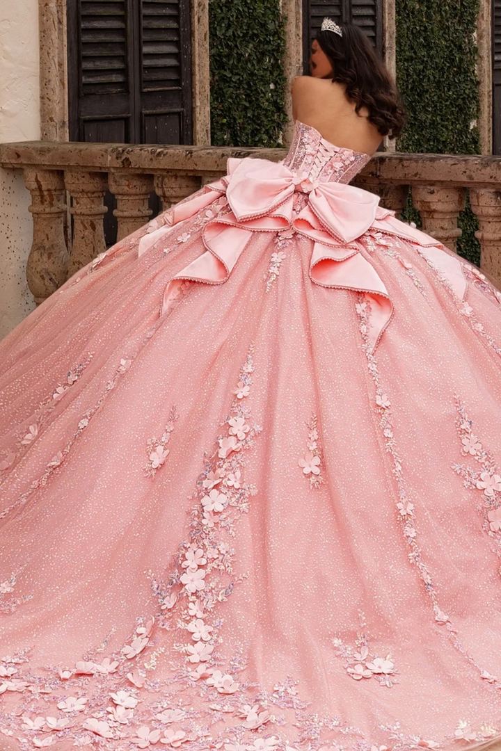 Description: Step into your quinceañera celebration with this enchanting pink gown that captures the essence of youthful elegance. The strapless, sleeveless design features meticulously placed beaded appliques and romantic ruffles that create dimension and movement. Delicate pleating throughout the bodice adds structure and refinement, while the soft pink hue flatters all complexions. This Sweet 15 dress combines intricate beadwork with flowing silhouette details, delivering a look that is both sophisticated and whimsical—ideal for making an unforgettable entrance on your milestone evening.