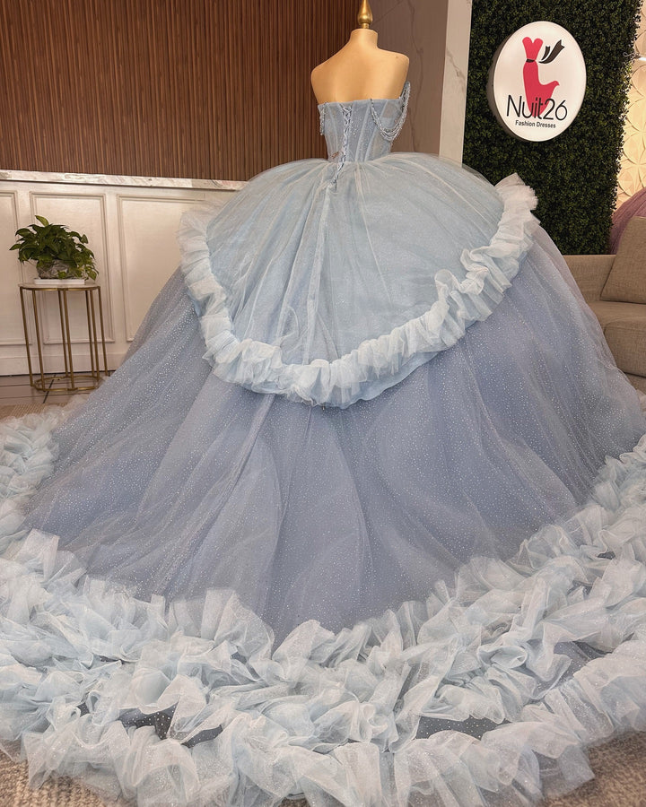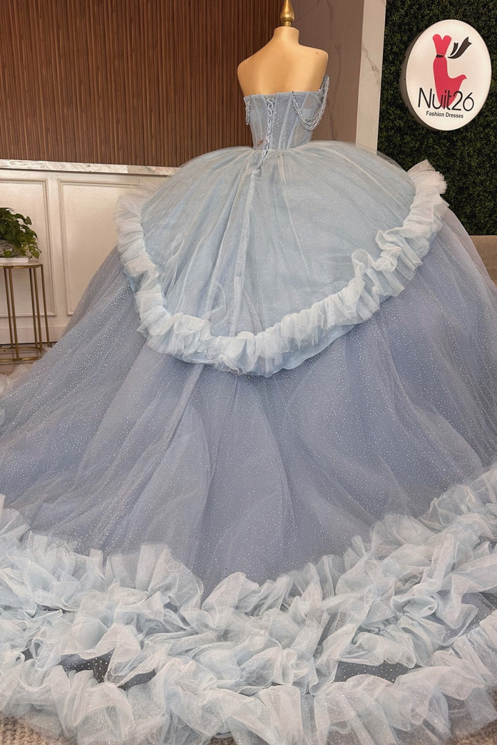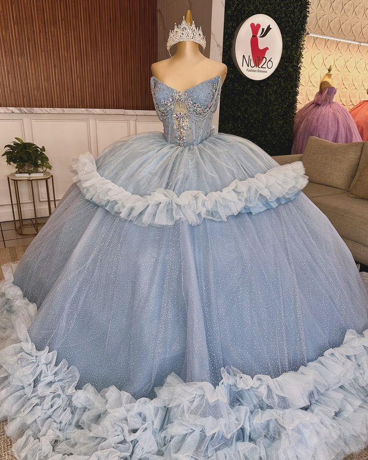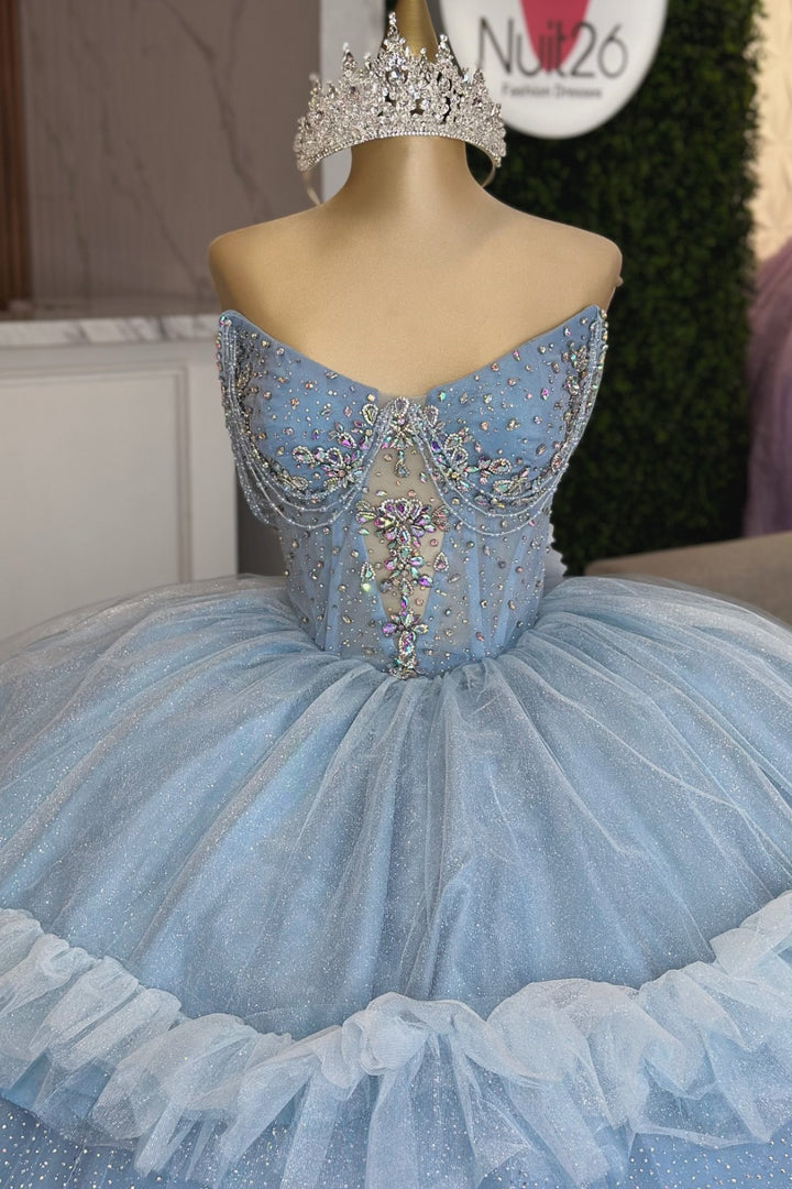 Strapless Sleeveless Beaded Sequins Tiered Blue Sweet 15 Quinceañera Dress WQ1586