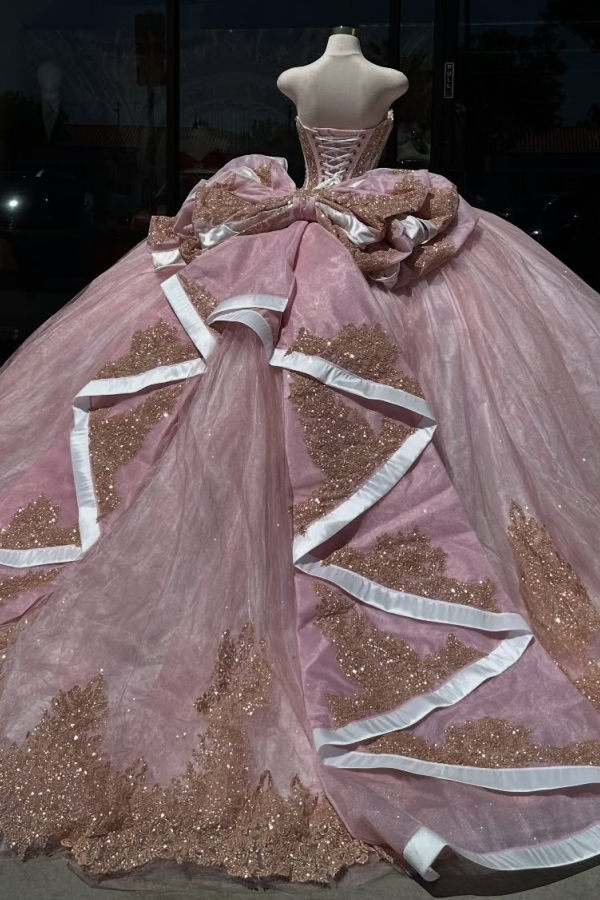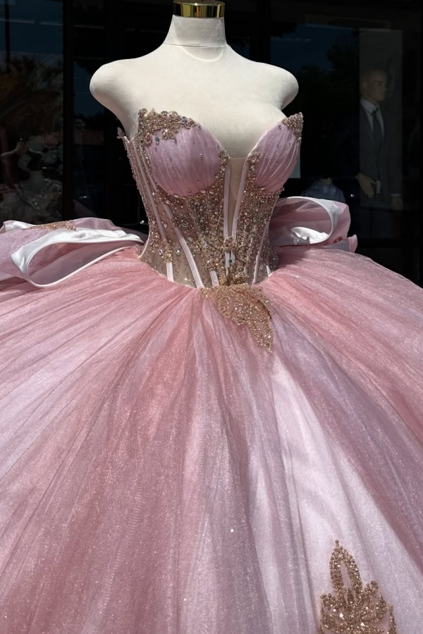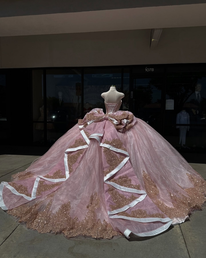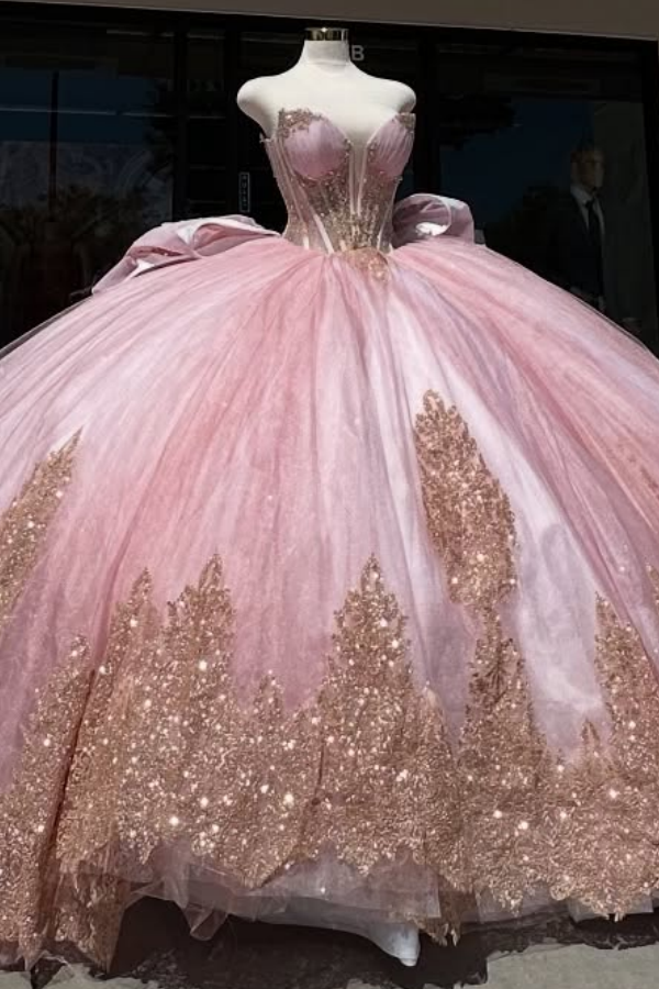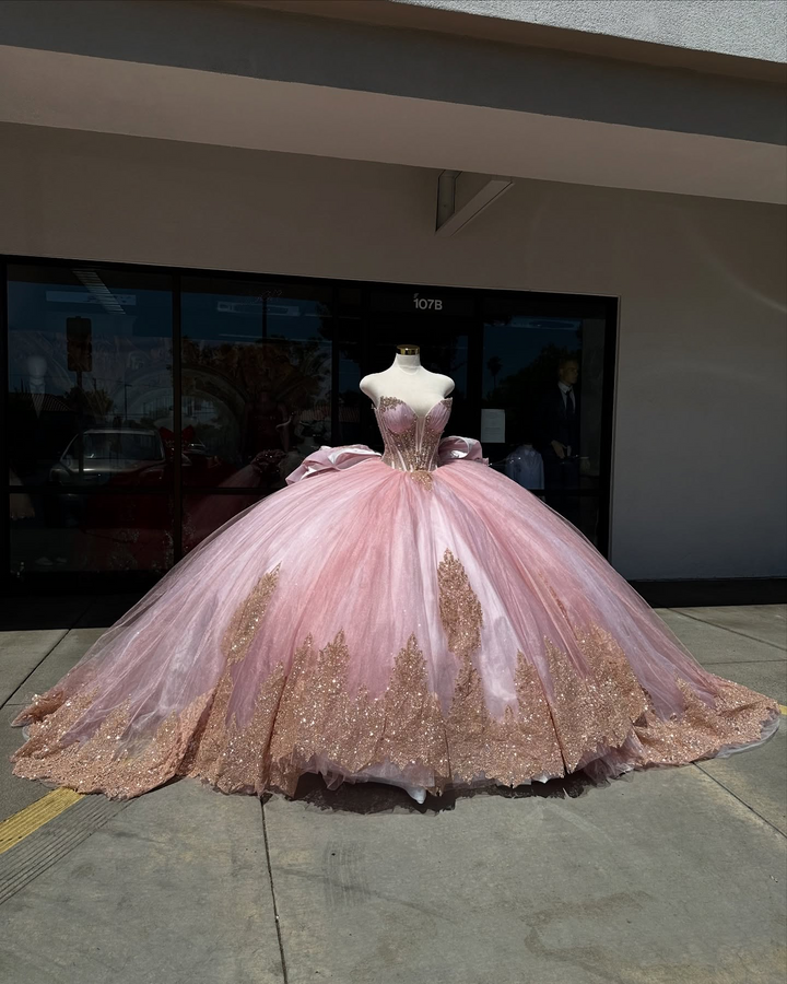 Description: This strapless, sleeveless pink quinceañera dress combines youthful charm with elegant details. Featuring delicate beaded gold appliques and a graceful bow knot, it adds a touch of sophistication and sparkle to the design. The soft pink shade enhances the celebratory spirit, making it an ideal choice for a Sweet 15 event that demands both style and refinement.
