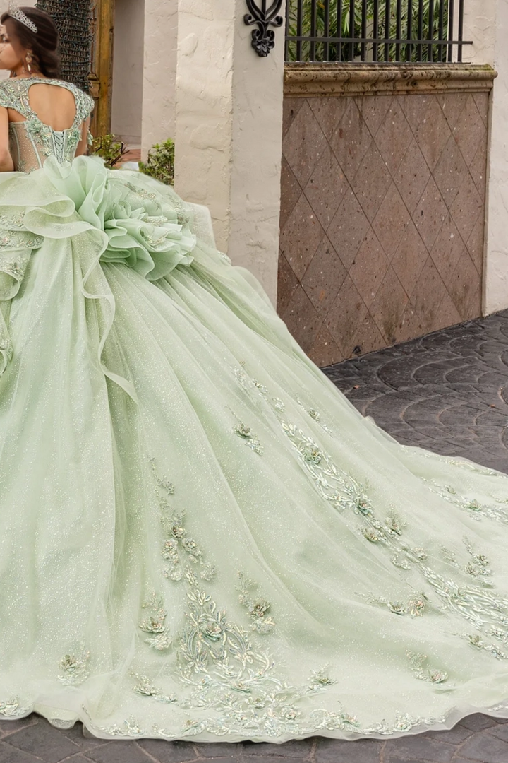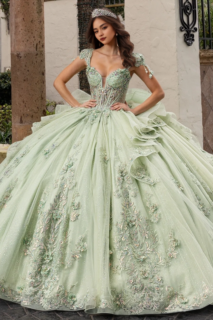 Description: Celebrate your special milestone in this stunning mint green quinceañera dress, designed to make you feel like royalty. The sweetheart neckline elegantly frames your shoulders, while delicate straps provide comfortable support throughout the evening. Intricate appliqués and cascading ruffles adorned with floral details create dimensional texture and movement, ensuring you stand out in any ballroom. The sleeveless silhouette offers a sophisticated, timeless look perfect for formal occasions. This dress combines traditional quinceañera elegance with modern design elements, making it an unforgettable choice for your coming-of-age celebration.