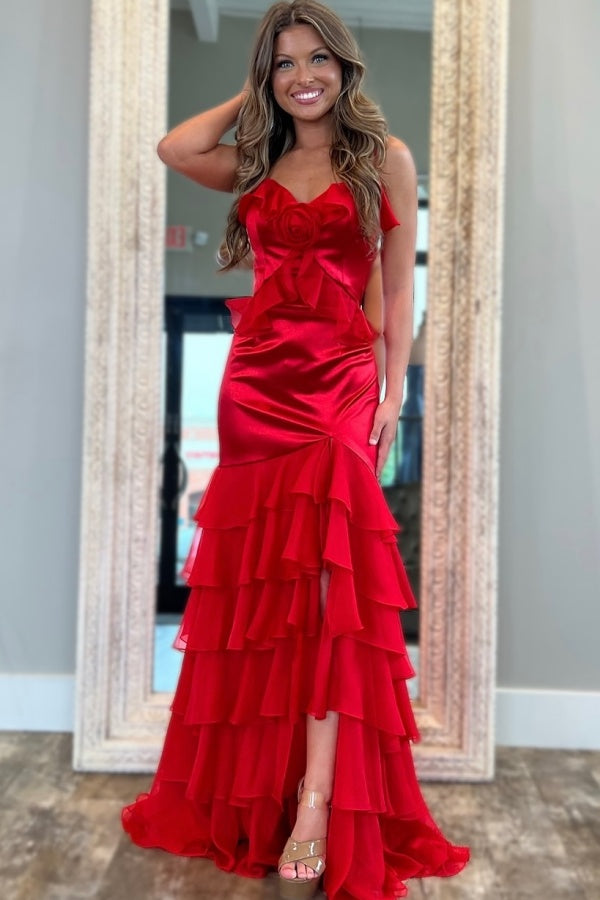 V Neck Spaghetti Straps 3D Flower Ruffles Tiered High Side Slit and Train Prom Dress WU1434