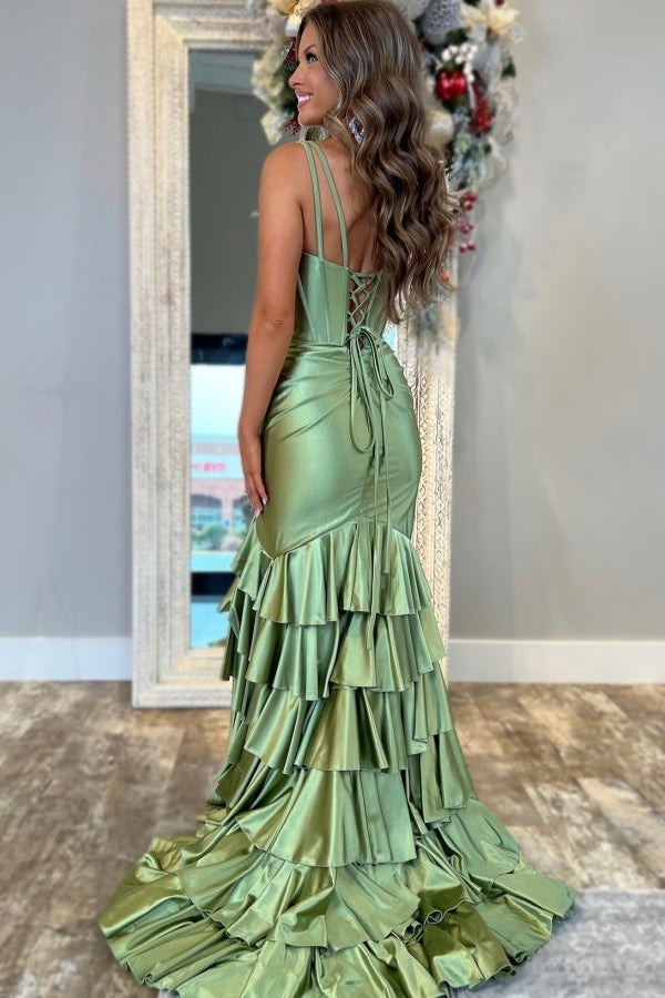 V Neck Spaghetti Straps Tiered High Side Slit and Train Prom Dress WU1160