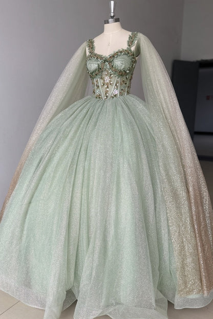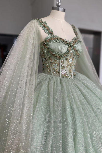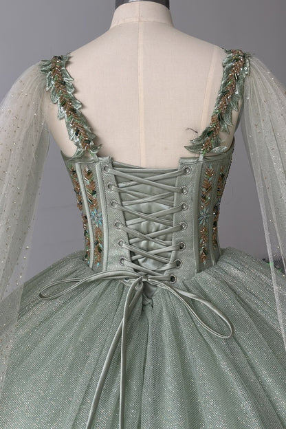 Description: Make a statement with this enchanting Sage Tulle Green Quinceanera dress, adorned with sparkling glitter details. The V-neck and long sleeves, along with the delicate flower appliques and shimmering beading, add a touch of elegance and grace to your formal evening party look. Perfect for sweet 16 celebrations.