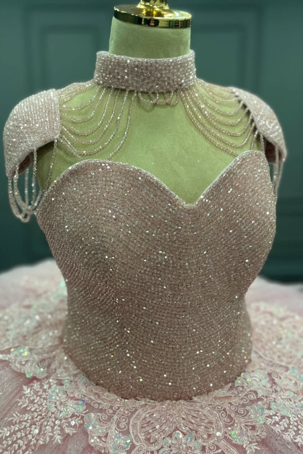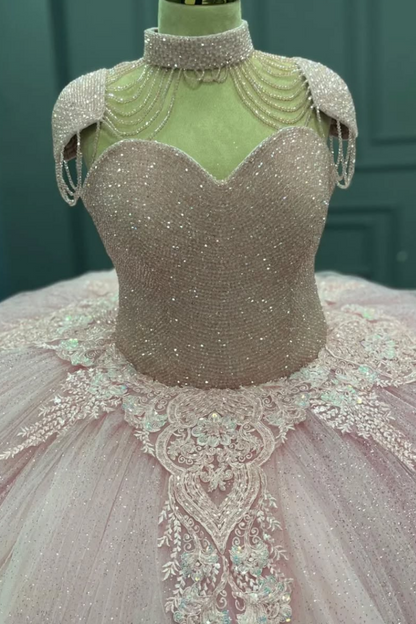 Description: Indulge in luxury and grace with our WQ1318 ball gown. Featuring a sweetheart neckline and cap sleeves adorned with delicate beaded appliques, this dress exudes elegance and charm. Made with soft baby pink tulle, it is the perfect choice for a quinceanera or formal evening event. Make a statement and feel like a princess on your special day.