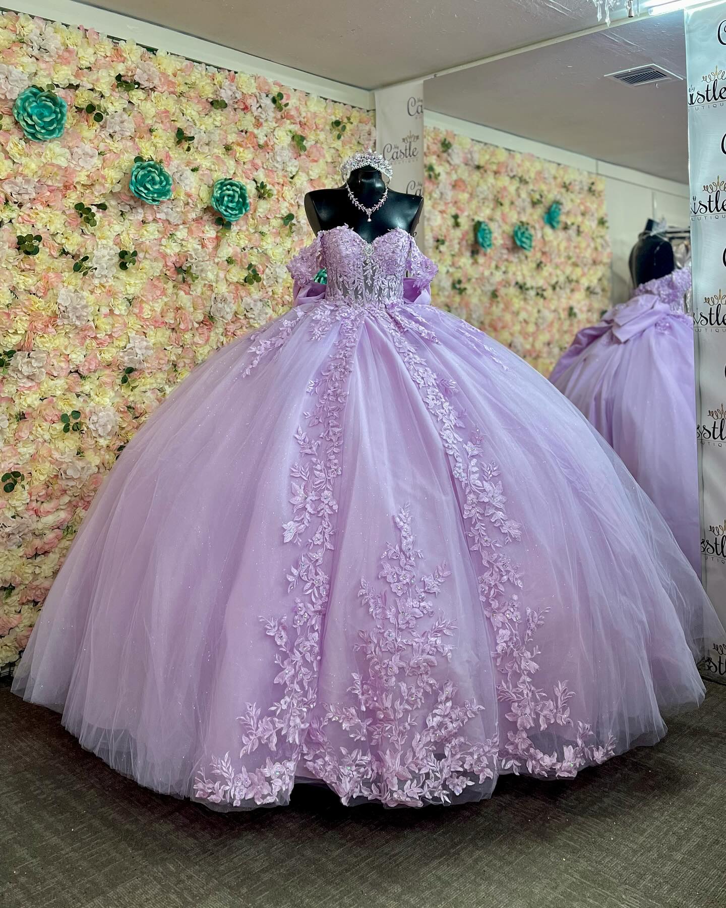 Description: Indulge in luxury with our WQ1345 Ball Gown, crafted with off-shoulder, sleeveless design and intricate appliques. Pleated and adorned with a big bow knot, this dress is the epitome of elegance. With a lace-up back and glitter accents, it's the perfect choice for a glamorous birthday party or a stylish Sweet 16 celebration. Choose lilac for a soft, romantic touch.