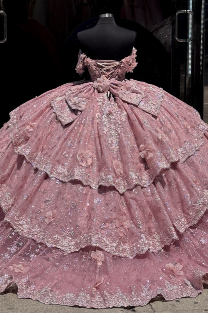 Description: This luxurious WQ1384 ball gown features an off shoulder design, sleeveless bodice, and intricate beaded appliques that create a 3D effect. The dress is adorned with delicate ruffles and tiered layers of sparkly pink tulle, making it the perfect choice for a quinceanera or sweet 16 birthday party. Stand out in this exclusive and elegant dress.