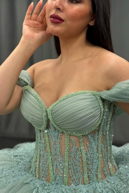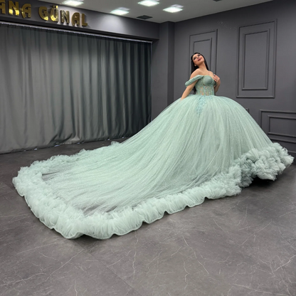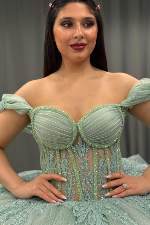 Description: This customizable Quinceañera dress, in a stunning mint green color, features a ball gown silhouette, off-shoulder neckline, pleated bodice, and intricate beaded appliques. The tiered ruffled tulle skirt adds volume and movement, making it perfect for a birthday party or formal event. With customizable sizing options, this dress is sure to make any Sweet 16 celebration unforgettable.