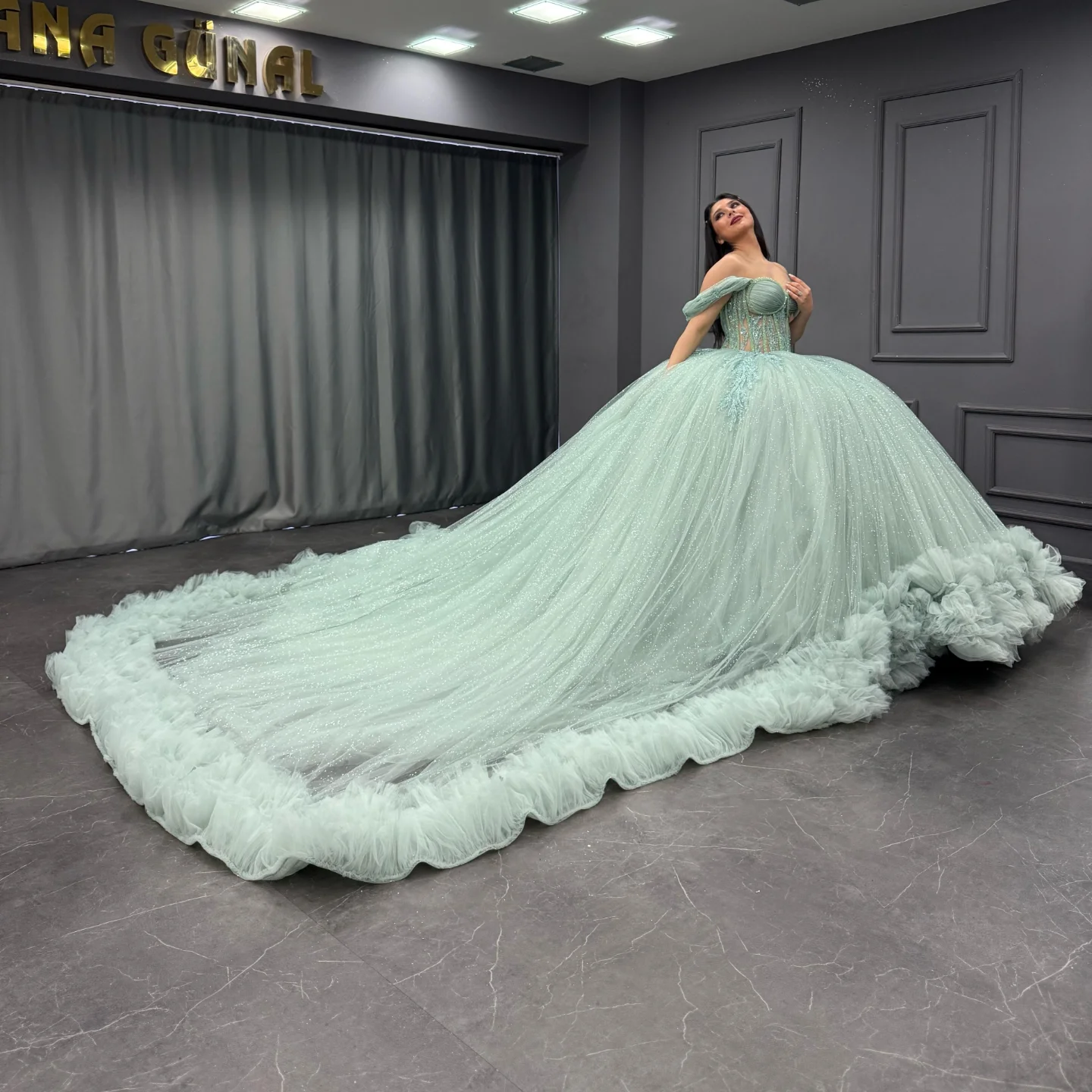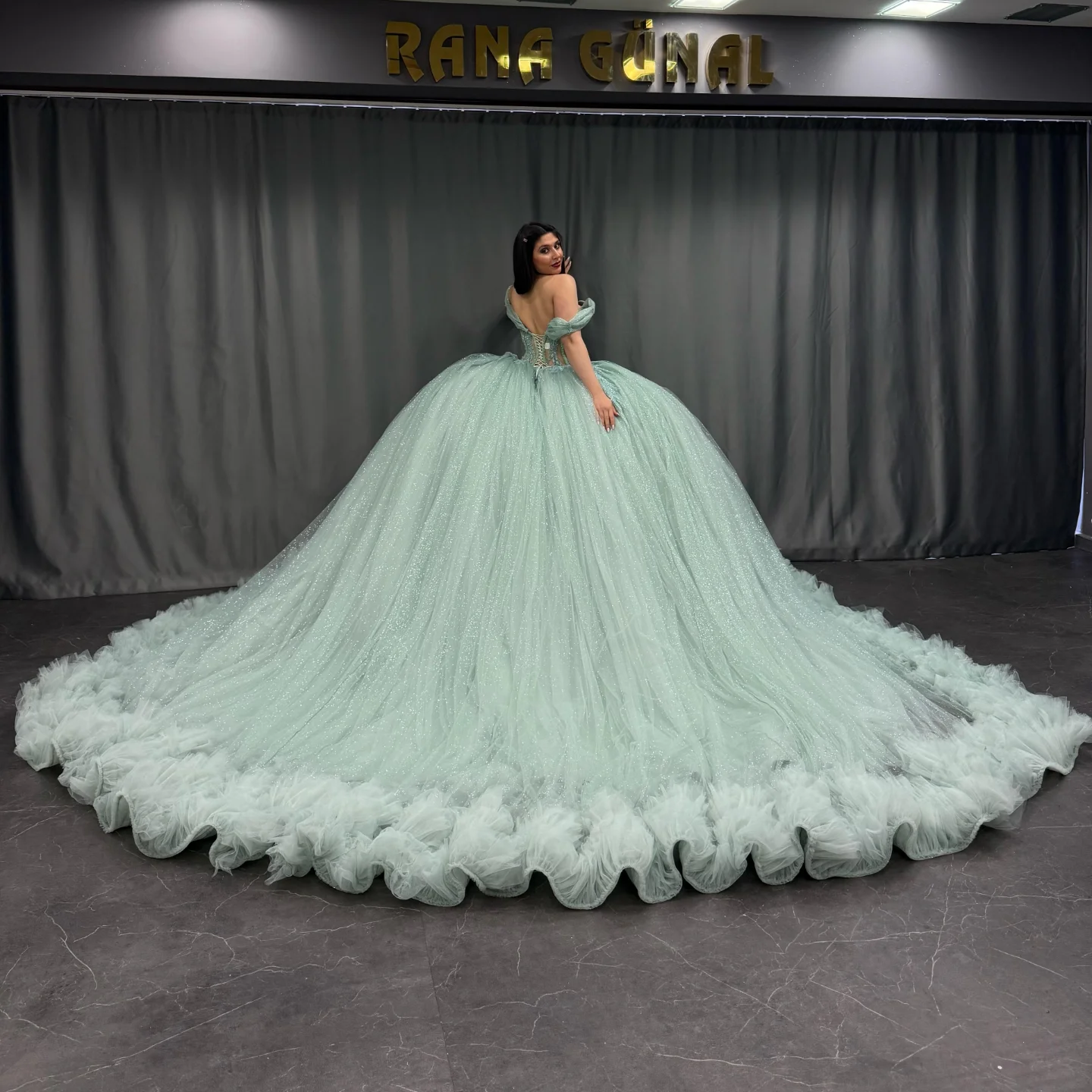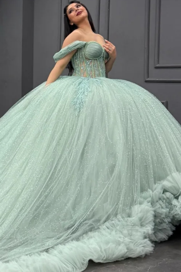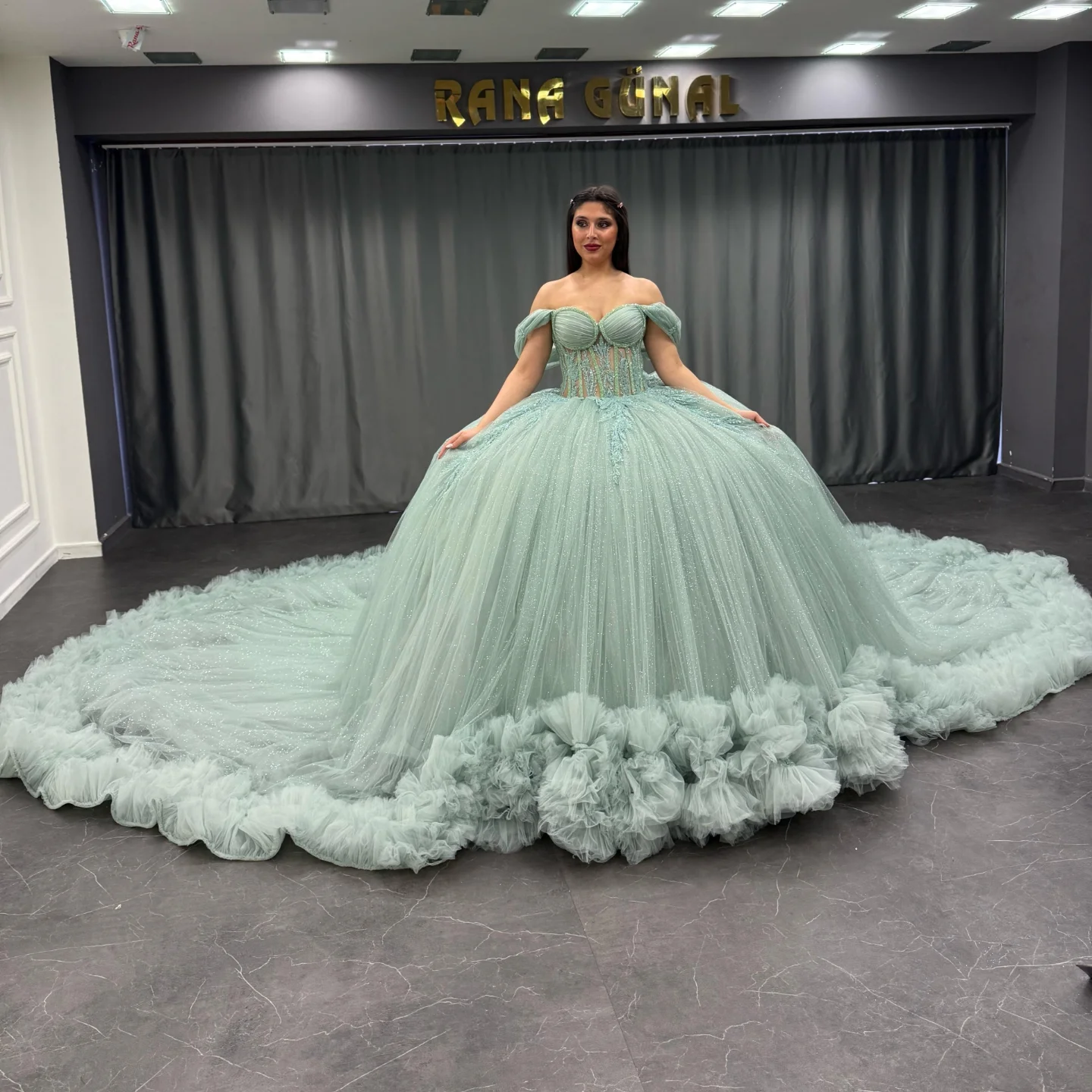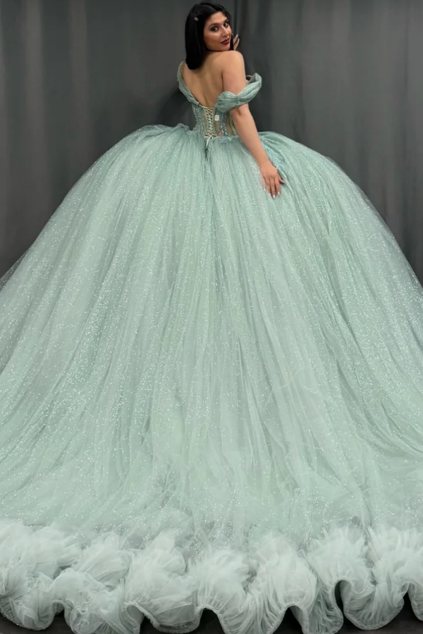 Off Shoulder Sleeveless Beaded Appliques Ruffles Mint Green Quinceañera Dresses WQ1412