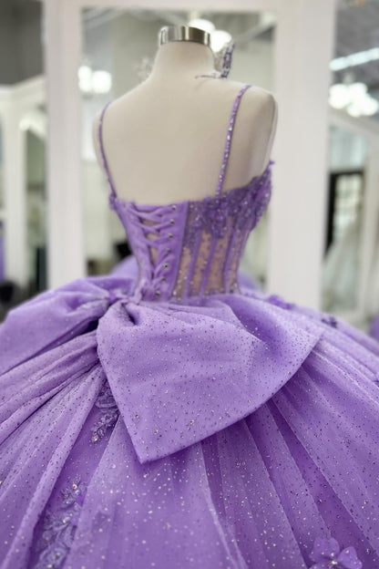 WQ1437 - Ball Gown Strapless Spaghetti Straps Sleeveless Beaded 3D Flowers Appliques Pleated Bow Knots Purple Tulle Quinceanera Dress Evening Formal Gown Birthday Party Dress for Sweet 16