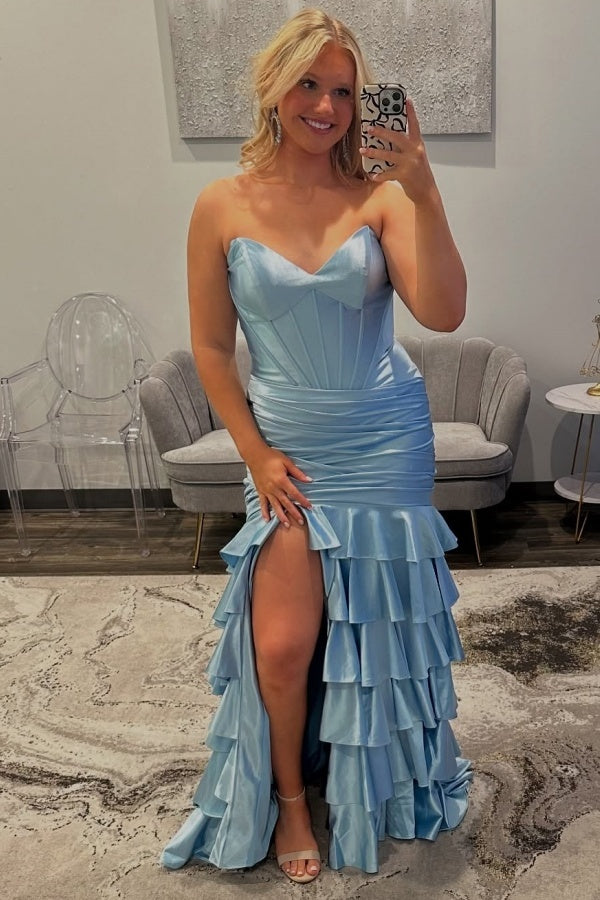 Mermaid Strapless Tiered Side Slit and Train Prom Dress WU1034
