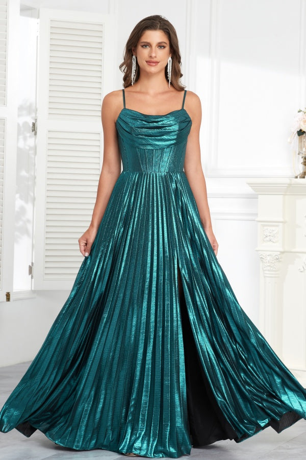 A-Line Strapless Spaghetti Ruched Criss Cross Straps High Side Slit Prom Dress WU1096