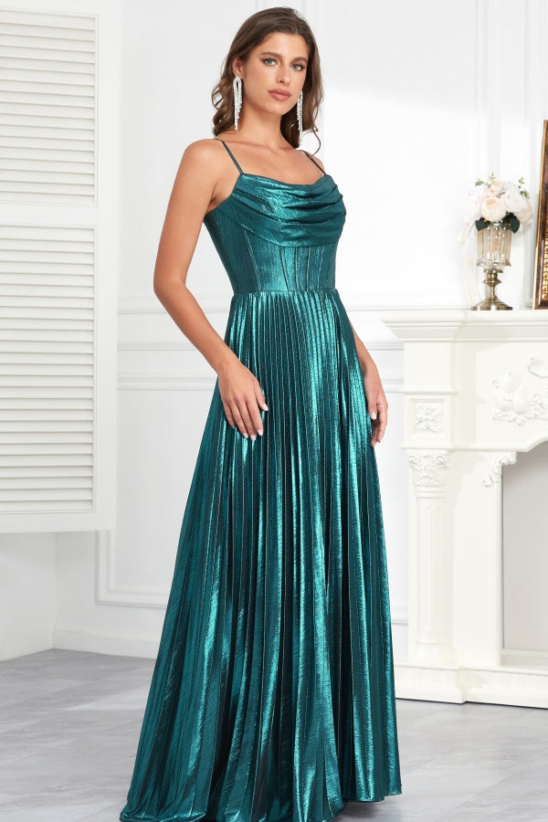 Description: This WU1096 dress features a modern A-line design, accentuated by a strapless neckline and spaghetti straps. The pleated and ruched detailing creates a chic and elegant look, perfect for any prom or formal event. The criss cross straps and high side slit add a touch of sophistication, making it a versatile choice for a wedding guest dress.