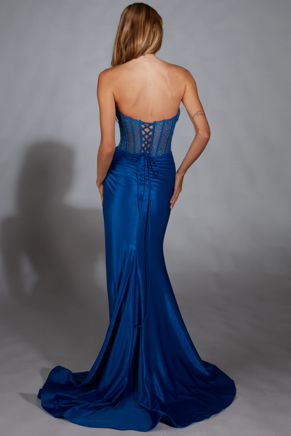 V Neck Spaghetti Straps Beaded High Side Slit and Train Prom Dress WU1098