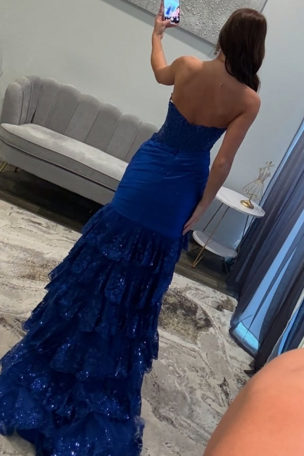 Description: Elevate your style with our Glitter & Sparkly Mermaid Prom Dress! Featuring stunning sequins, lace appliques, and a tiered design, this dress is destined to make you shine. The strapless and sleeveless design, along with the open back, adds a touch of elegance. Perfect for any evening event, this floor length dress will make you stand out from the crowd.