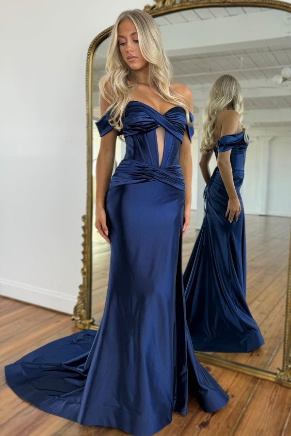 Off Shoulder Pleated Red Satin High Side Slit and Train Prom Dress WU1189