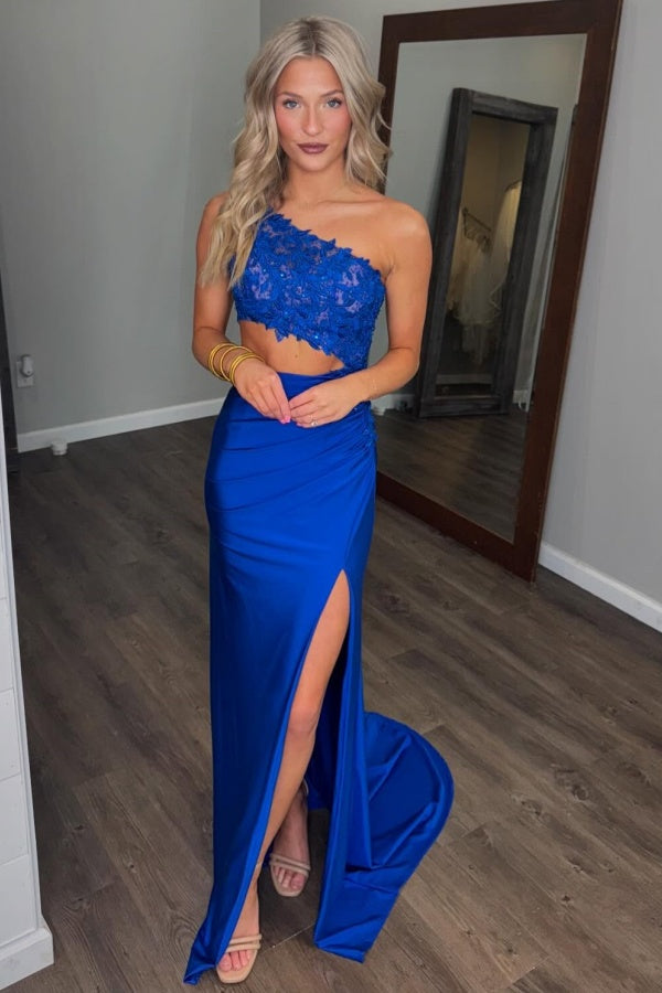 One Shoulder Lace Appliques Prom Dress High Side Slit and Train WU1243