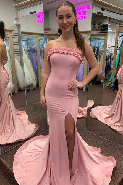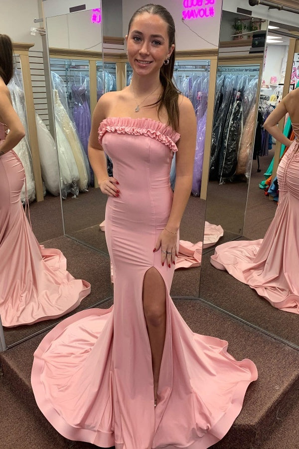 Strapless Ruched High Side Slit and Train Prom Party Dress WU1259