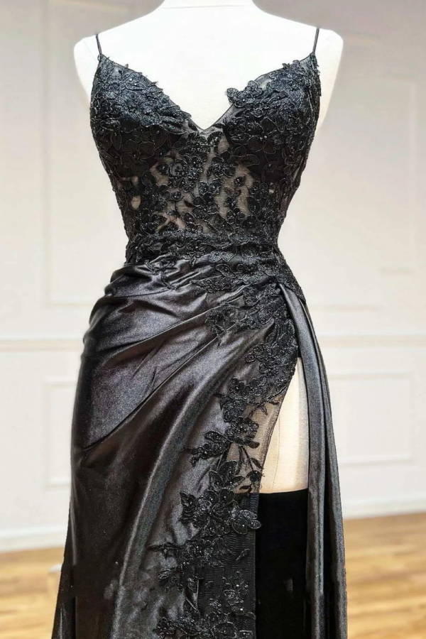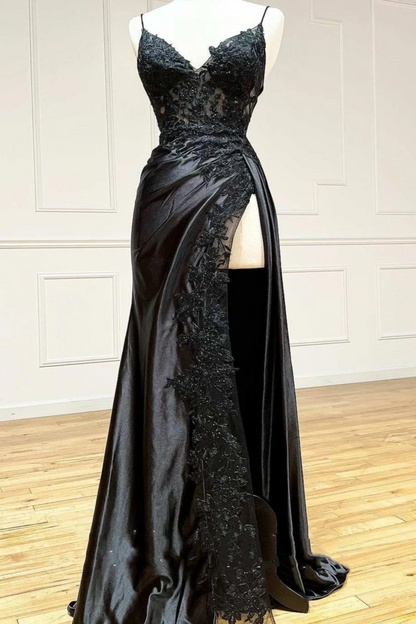 V Neck Spaghetti Straps Lace Appliques High Side Slit and Train Prom Dress WU1276
