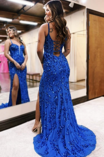 Sweetheart Spaghetti Straps Sequins High SIde Slit and Train Prom Dress WU1278