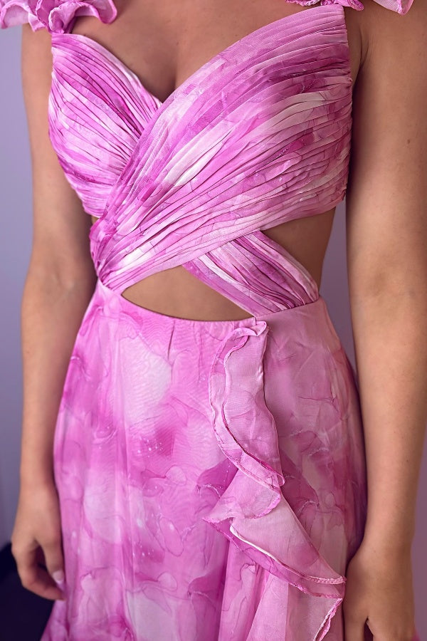 Description: Indulge in luxury with WU1342. This elegant A-line dress features a sweetheart neckline, delicate straps, and a pleated flower design, exuding sophistication and grace. The high side slit and train add a touch of drama, while the open back and zipper closure create a stunning silhouette. Perfect for your next special occasion.