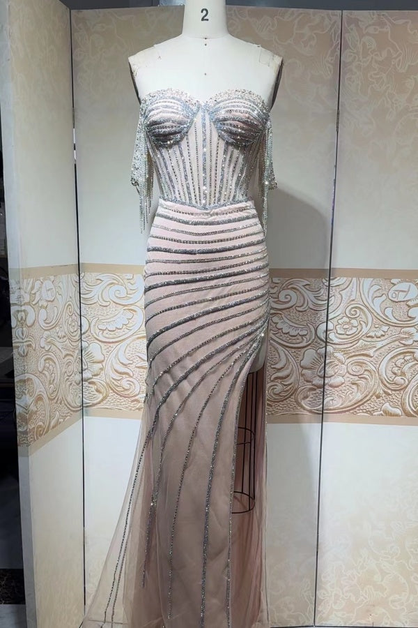 Off Shoulder Crystal Beaded High Side Slit and Train Prom Dress WU1379