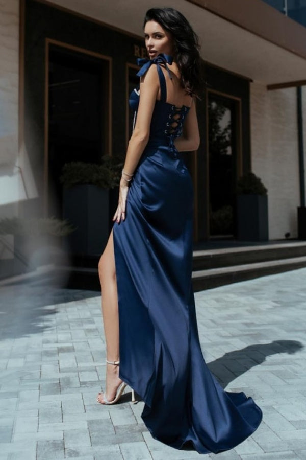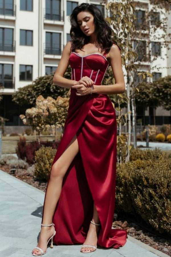 Strapless Straps Crystal Beaded High Side Slit and Train Prom Dress WU1419