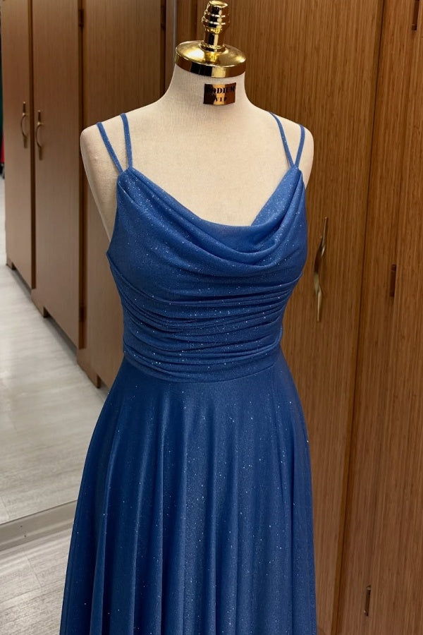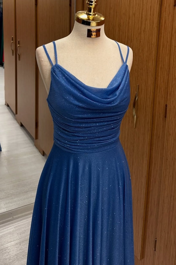 Description: This luminous A-line gown combines subtle glamour with refined design elements. The classic round neckline and delicate spaghetti straps create a balanced frame, while the sleeveless cut offers timeless elegance. Meticulous pleating adds dimensional texture throughout, complemented by a light-catching glitter finish that elevates the floor-length silhouette. Expertly crafted for versatility, this dress transitions effortlessly between proms, formal gatherings, evening events, and sophisticated cocktail occasions.