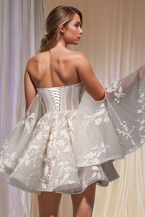 A-Line Off Shoulder Bell Sleeves Appliques Lace Up ShortWedding Dress WW1040